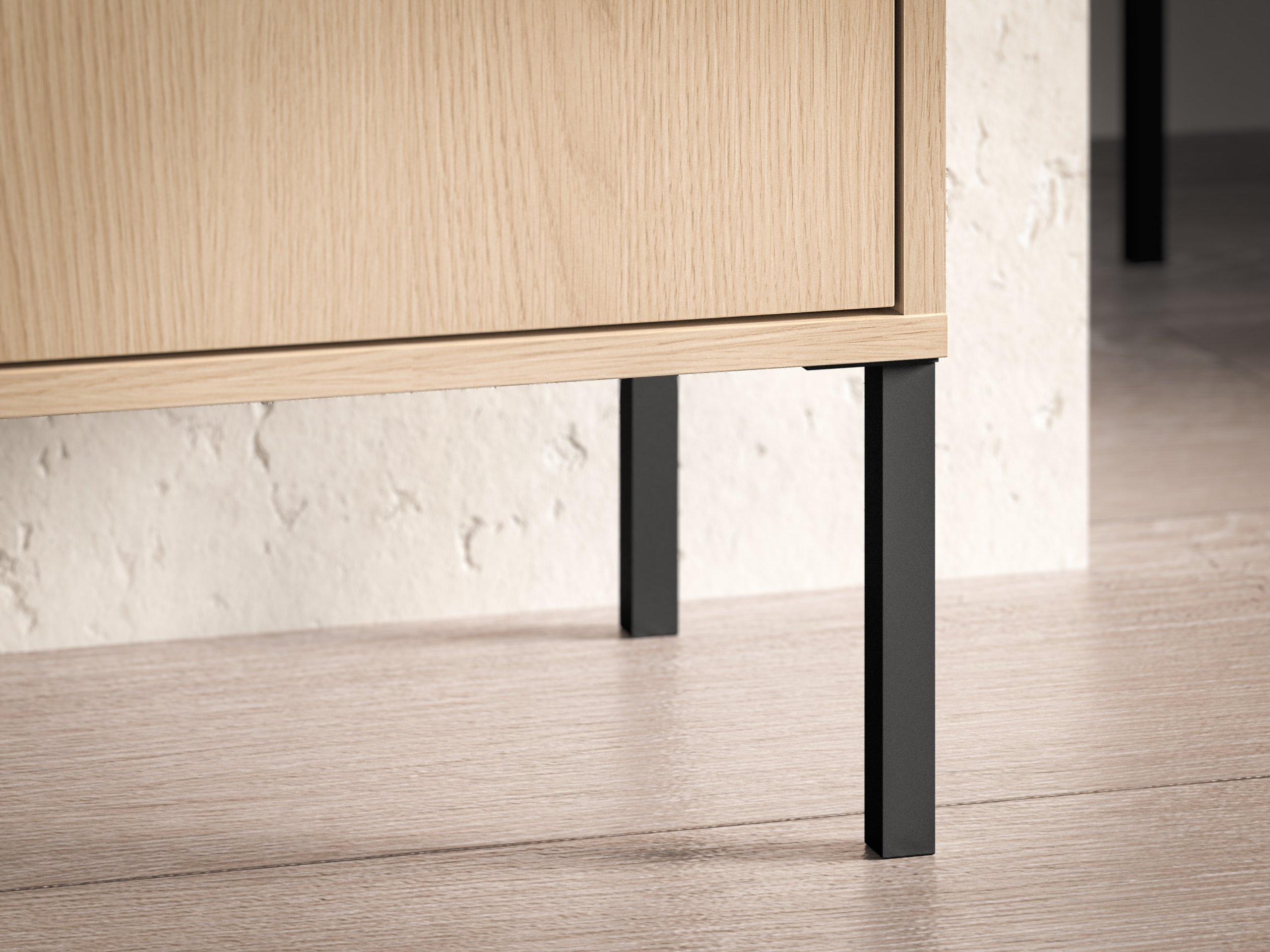 Jedna od najprepoznatljivijih karakteristika noćnog ormarića Barnee 05 su visoke metalne noge. Podignuta konstrukcija omogućuje jednostavno čišćenje poda ispod ormarića i daje izgled prozračnosti te lakoće. Takav dizajn je istovremeno estetski i praktičan, jer omogućuje i korištenje robotskog usisavača. Metalne noge su stabilne i pružaju čvrstu potporu, što produljuje vijek trajanja namještaja.