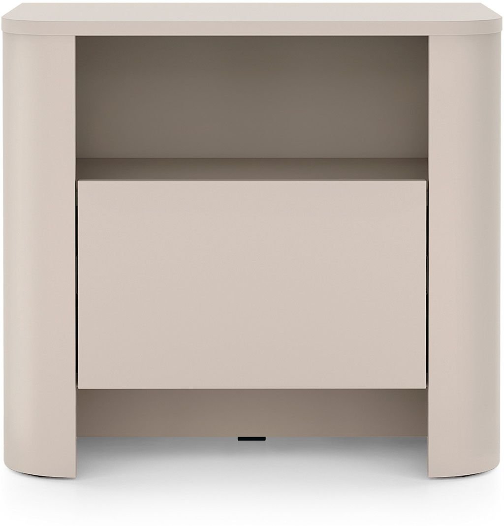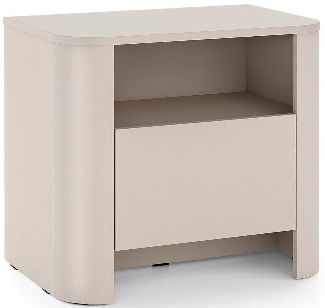 Noćni ormarić S58 izrađen je od visokokvalitetne iverice, koja osigurava trajnost i dug vijek upotrebe. Zaobljeni rubovi i glatka površina u kašmir boji dodaju dašak luksuza vašoj spavaćoj sobi. Njegova neutralna boja lako se uklapa u različite dekorativne stilove, od modernih do klasičnih, što znači da će se savršeno uklopiti u svaki ambijent vašeg doma.
