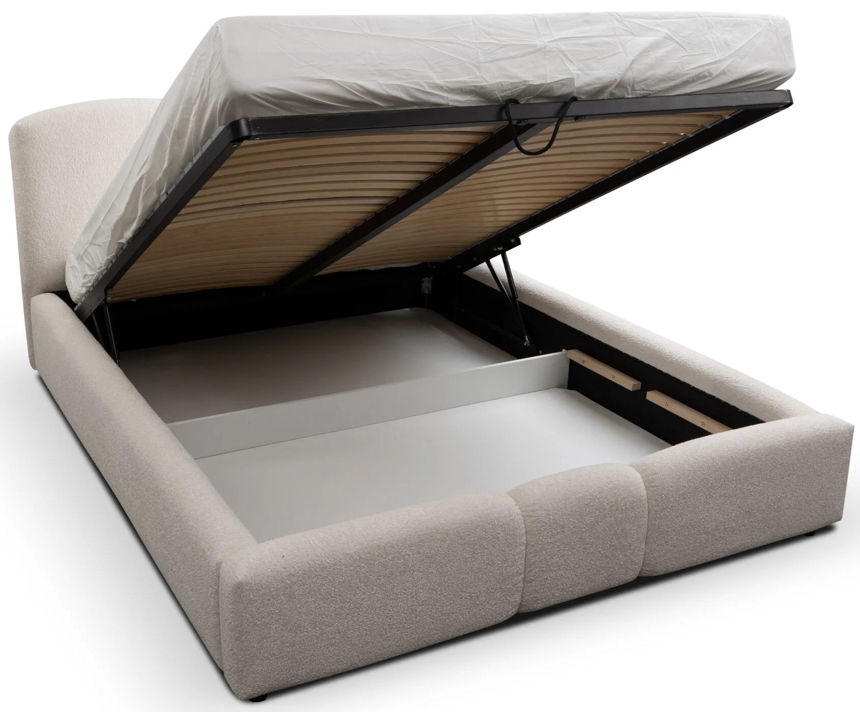 Jedna od glavnih prednosti kreveta Nolio je podizni mehanizam, koji omogućuje jednostavno podizanje ležajne površine. Ispod nje nalazi se prostrana ladica za posteljinu, u koju možete spremiti deke, jastuke ili sezonsku posteljinu. Ovo rješenje omogućuje maksimalno iskorištavanje prostora, a da se pritom ne naruši estetika ili udobnost. Mehanizam je dizajniran tako da podizanje teče glatko i bez napora, što znači da i svakodnevno spremanje može biti brzo i jednostavno.