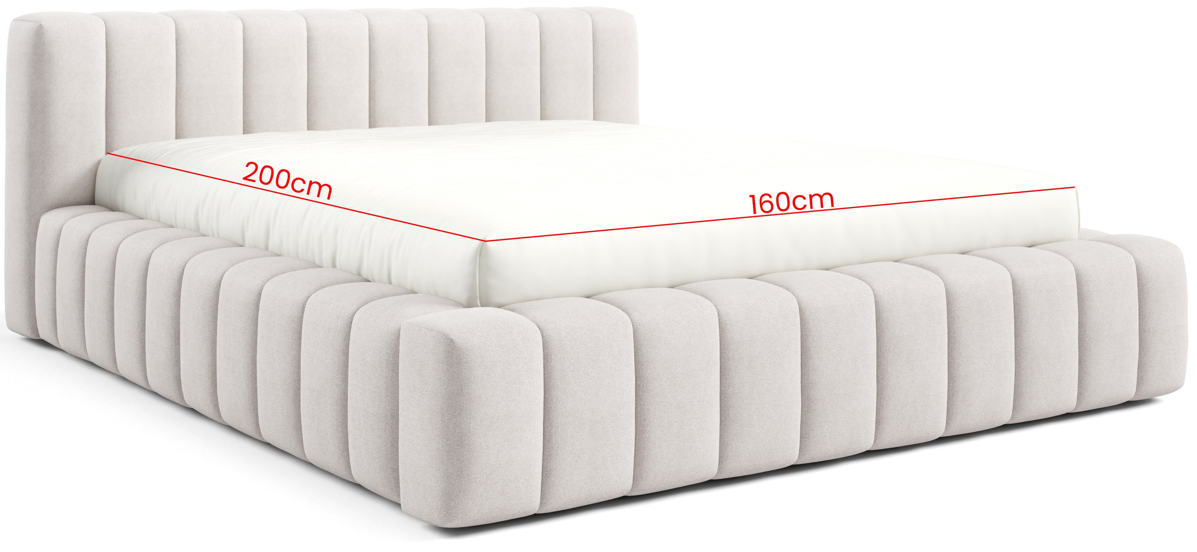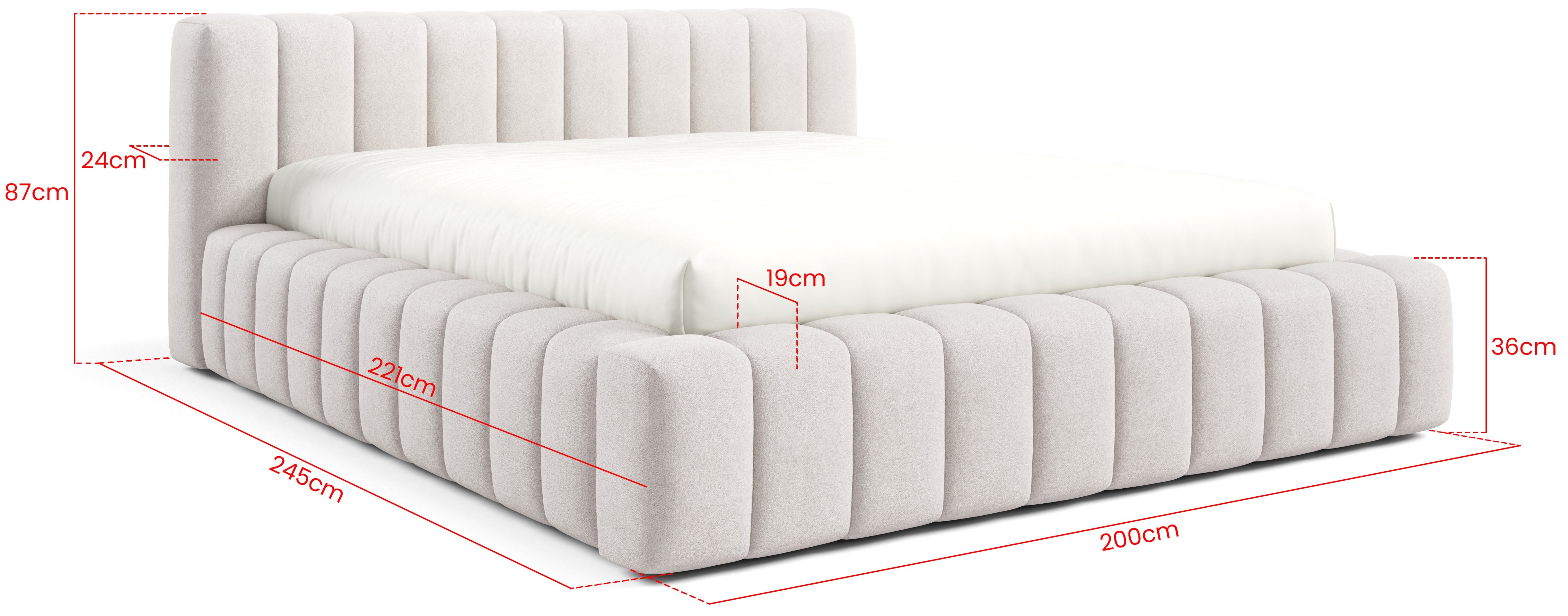 Ukupne dimenzije kreveta iznose 245x87 cm, pri čemu visina uzglavlja mjeri 87 cm, visina bočnice 36 cm, debljina bočnice 19 cm, debljina uzglavlja 24 cm, a visina nožica 1 cm (klizači). Dostupan je u različitim širinama ležajne površine: 160 pri duljini od 200 cm. Korisnik može birati između različitih kombinacija boja i vrsta tkanina, što omogućuje potpunu prilagodbu unutarnjem stilu spavaće sobe.
