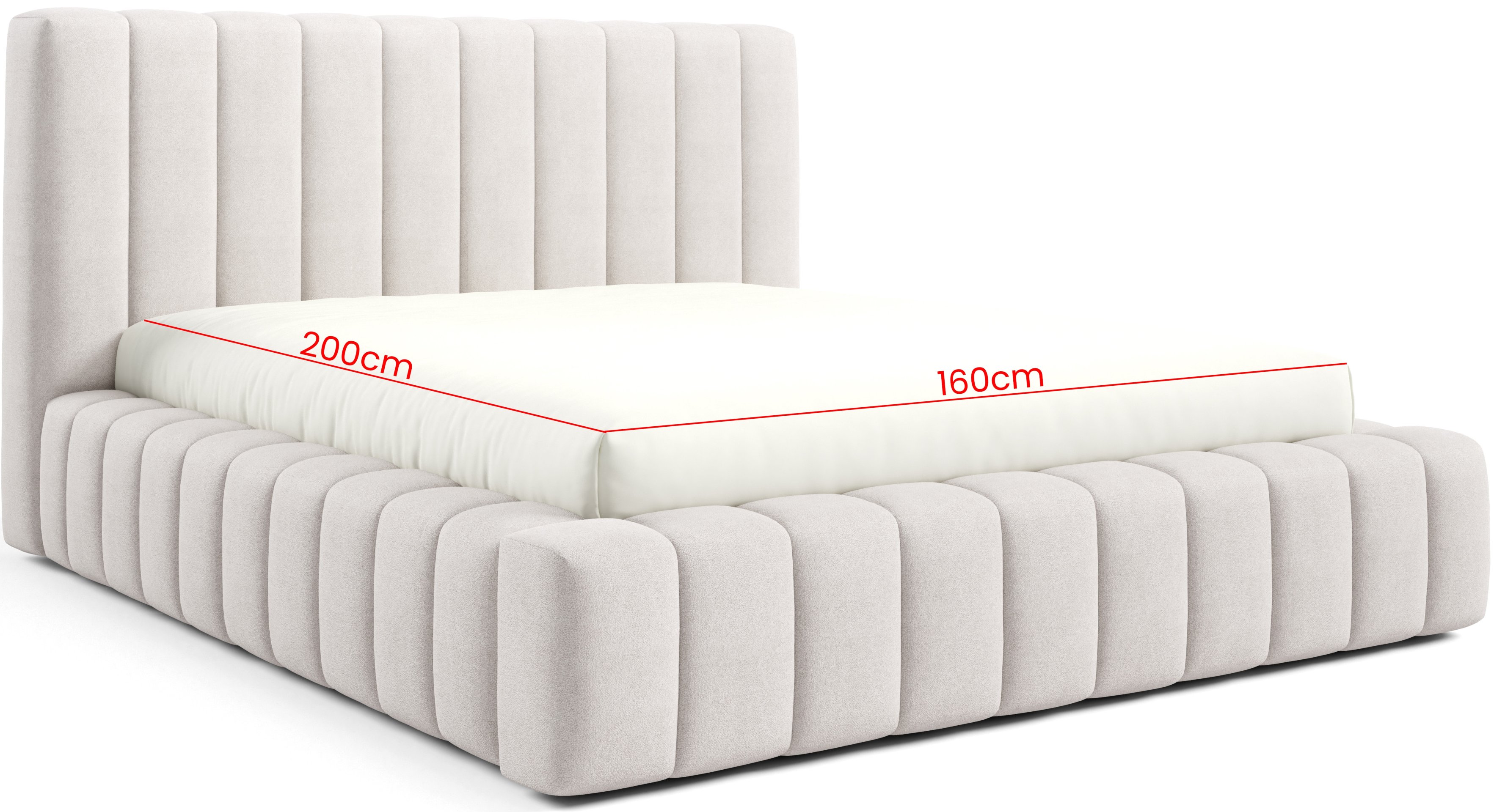 Ukupne dimenzije kreveta iznose 245x127 cm, pri čemu visina uzglavlja mjeri 127 cm, visina bočnice 36 cm, debljina bočnice 19 cm, debljina uzglavlja 24 cm, a visina nožica 1 cm (klizači). Dostupan je u različitim širinama ležišne površine: 160 pri duljini 200 cm. Korisnik može birati između različitih kombinacija boja i vrsta tkanina, što omogućuje potpunu prilagodbu unutarnjem stilu spavaće sobe.