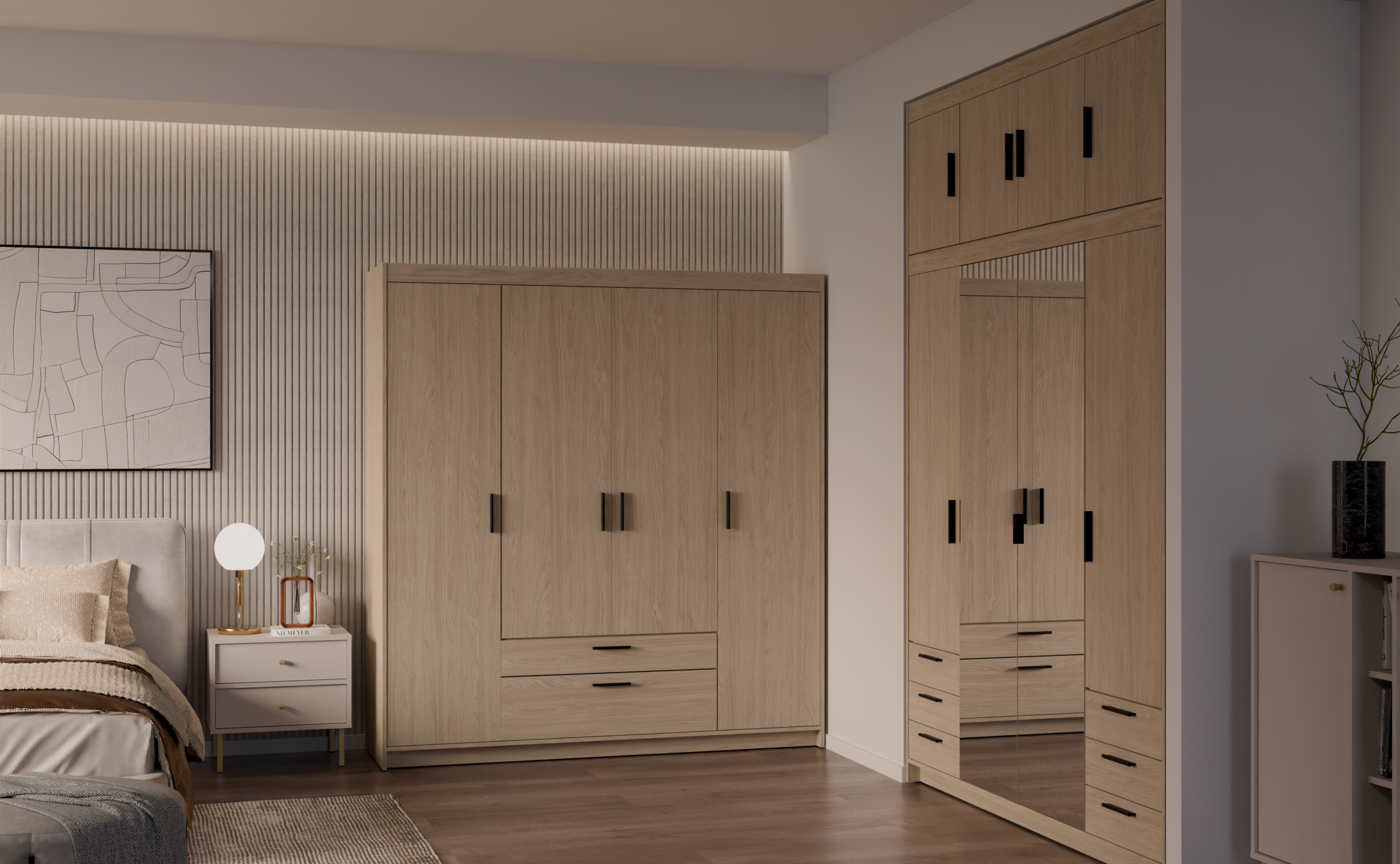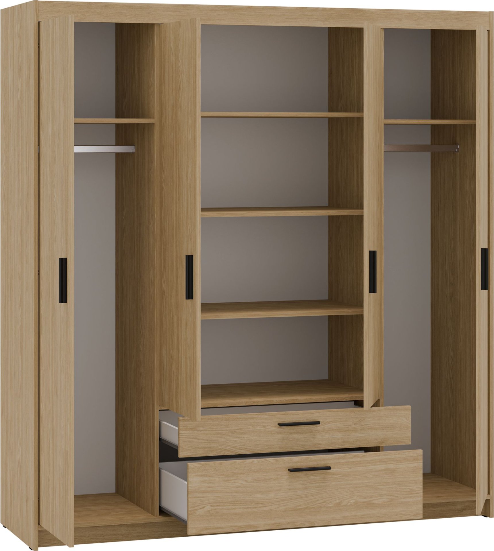 Boja uljeni hrast stvara ugodnu, toplu atmosferu koja se lako usklađuje s različitim kombinacijama boja i stilovima namještaja. Takav ton idealan je za one koji žele u prostoru zadržati svjetlost i dojam prostranosti. Površina laminirane ploče ima suptilan sjaj, koji je istovremeno otporan na svakodnevna opterećenja i jednostavan za čišćenje. Zbog svoje neutralnosti ormar se uklapa i u moderne i u klasične interijere, a može poslužiti i kao vizualna osnova za izraženije dodatke ili tekstil.