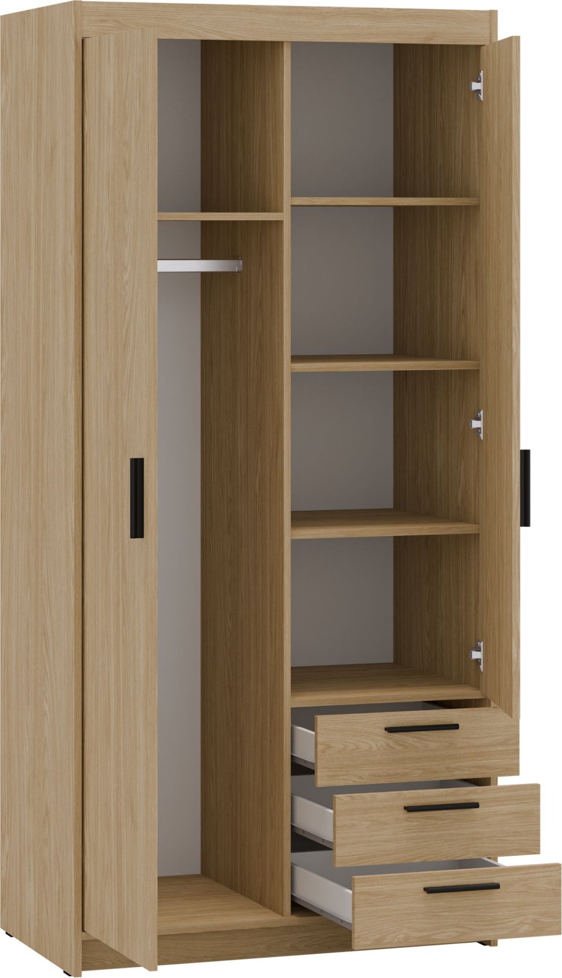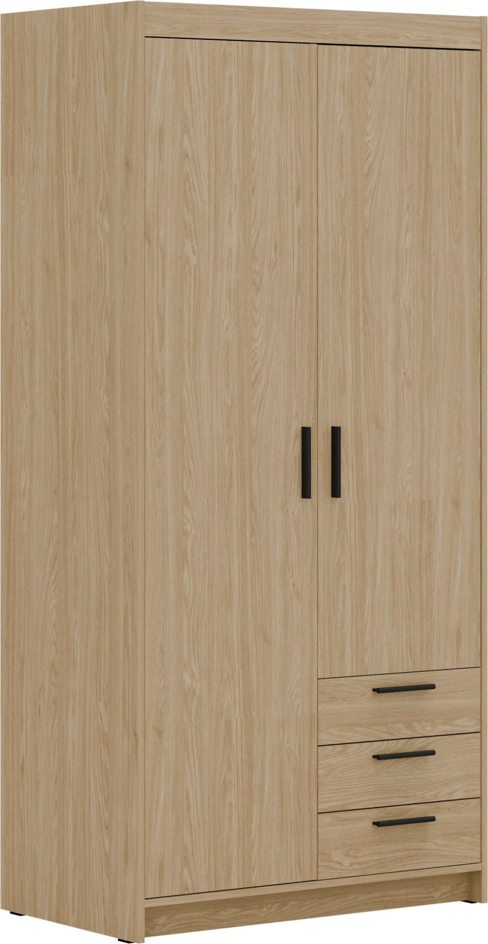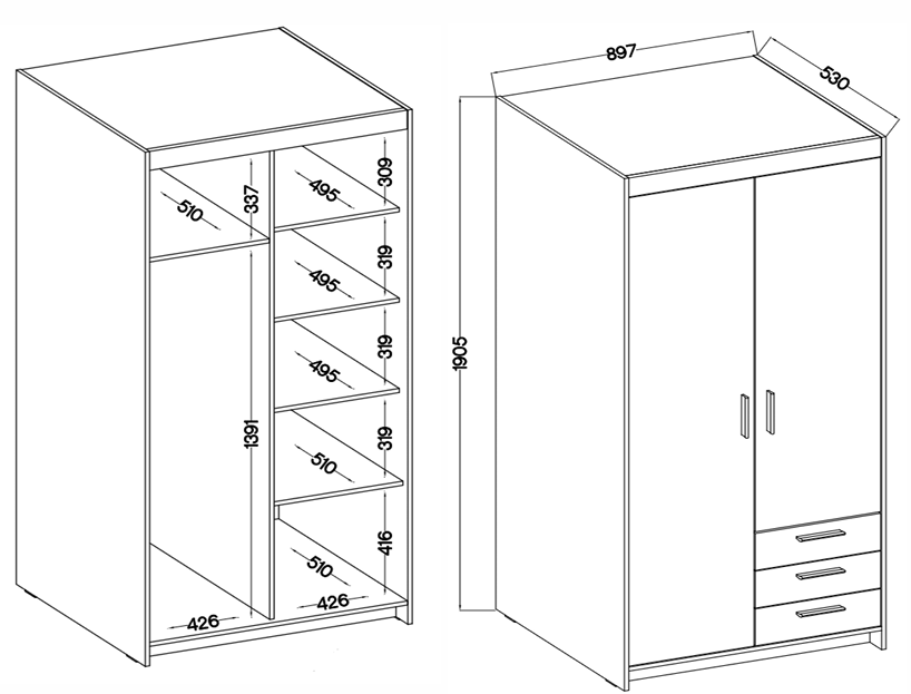 Ormar Elena DO02 3S dizajniran je s mišlju na praktičnu organizaciju odjeće i dodataka. Trodijelni dizajn omogućuje jasno raspoređivanje garderobe – odjeća, posteljina ili sezonski tekstil imaju svoje mjesto, što olakšava svakodnevnu upotrebu. Tri ladice u donjem dijelu nude dodatni prostor za manje tekstilne proizvode ili dodatke poput remena, rukavica ili čarapa.