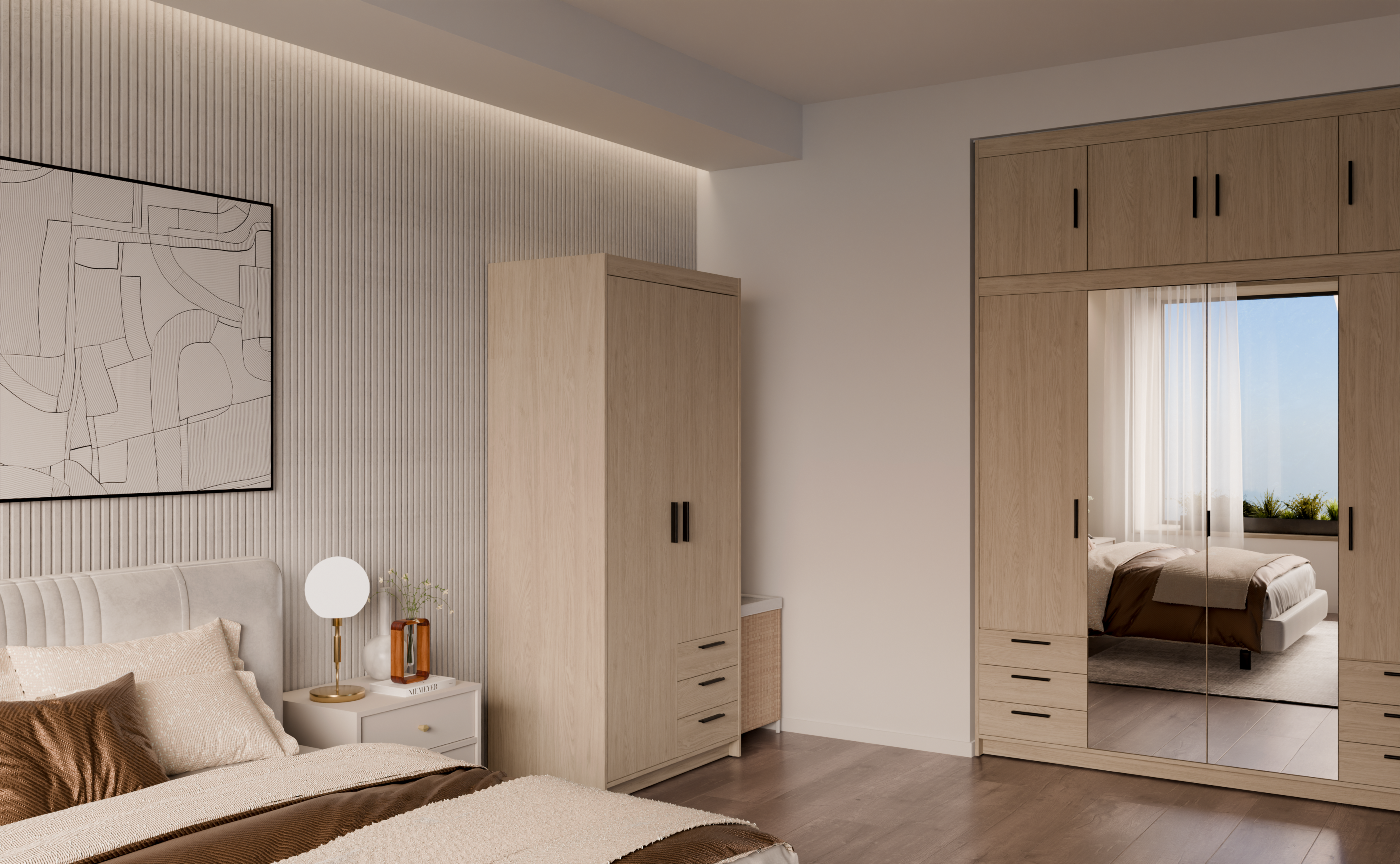 Unutrašnjost ormara podijeljena je tako da omogućuje kombinaciju vješanja i slaganja. Jedna strana obično je namijenjena vješalici za dužu odjeću, a druga policama na kojima se pregledno mogu složiti majice, puloveri ili posteljina. Tako garderoba ostaje uredna, a sadržaj uvijek dostupan.
