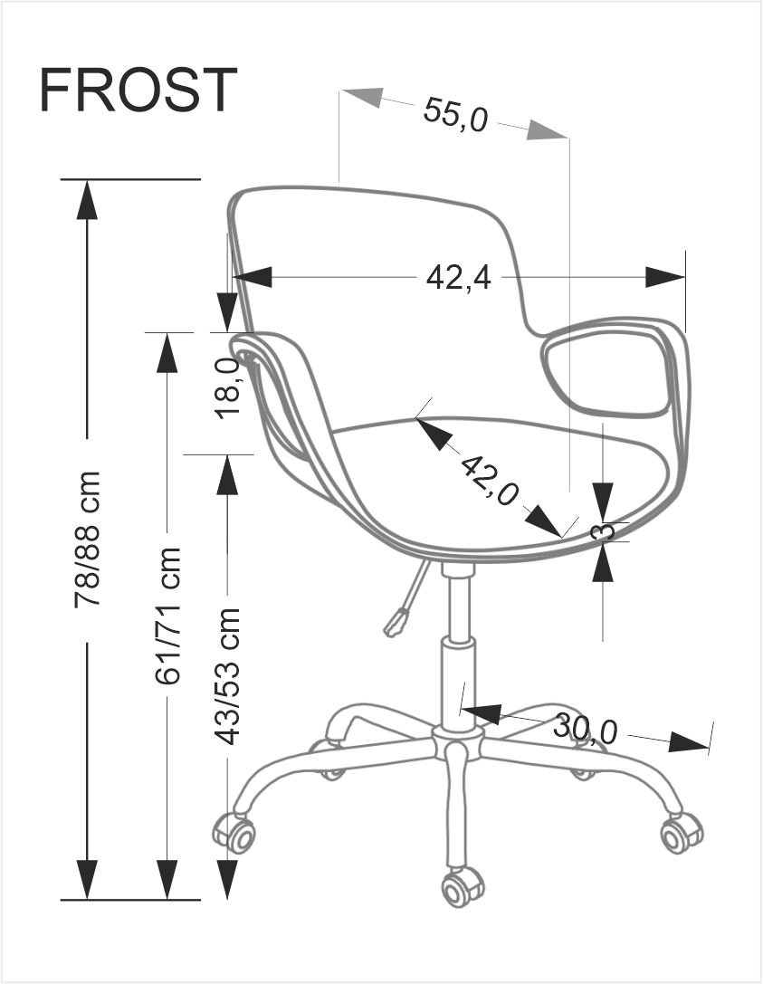 Sjedalo i naslon stola Frost presvučeni su kvalitetnom eko kožom koja je ugodna na dodir, a istovremeno jednostavna za čišćenje. Ovaj materijal je popularan zbog svoje postojanosti i otpornosti na svakodnevno trošenje. Konstrukcija od polipropilena dodatno doprinosi lakoći stolca, a da pritom ne smanjuje stabilnost ili čvrstoću. Kombinacijom ovih materijala Halmar postiže idealnu ravnotežu između funkcionalnosti i estetike.