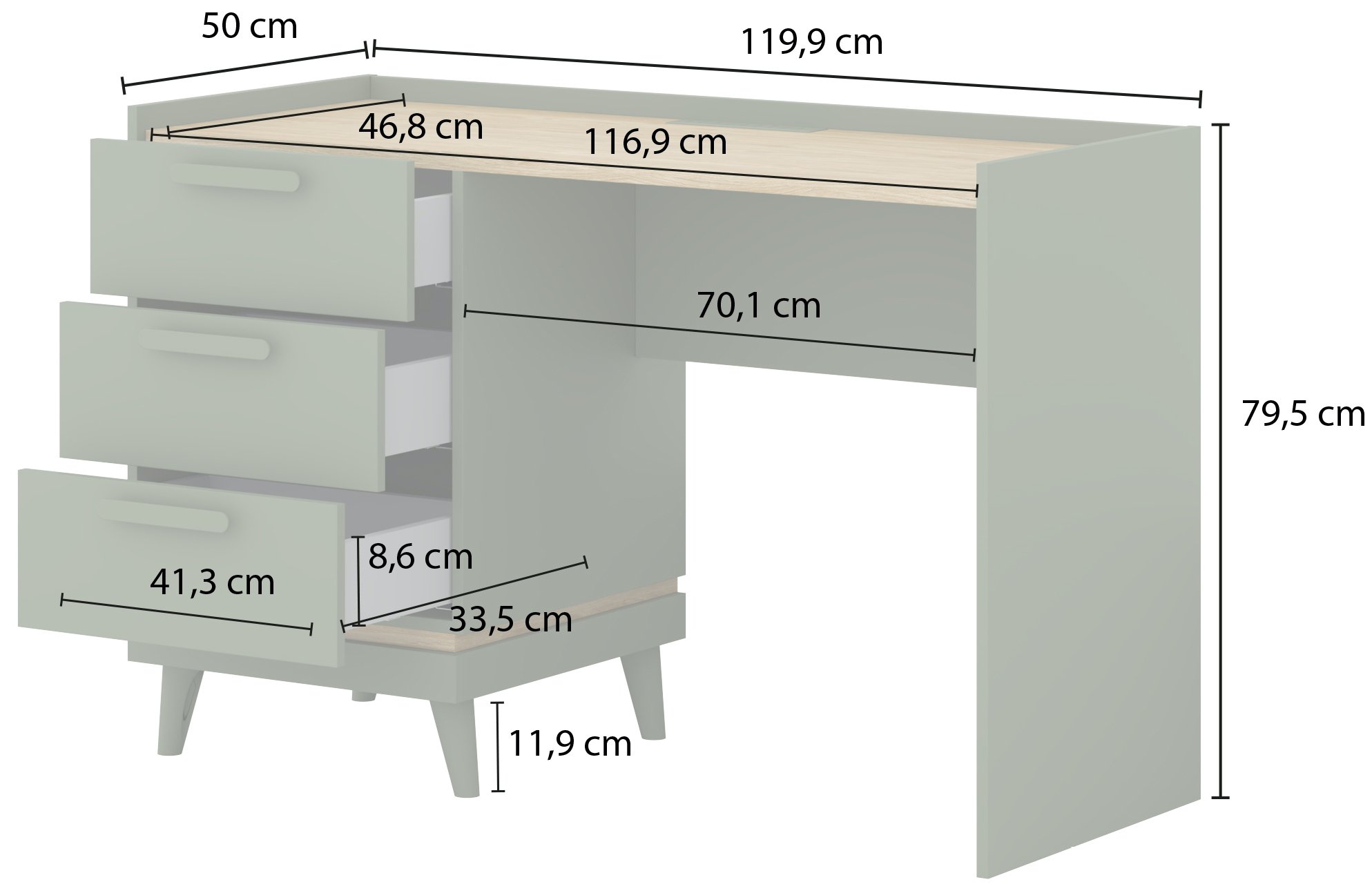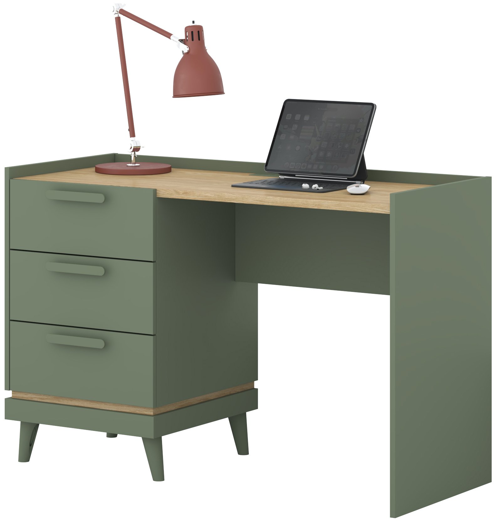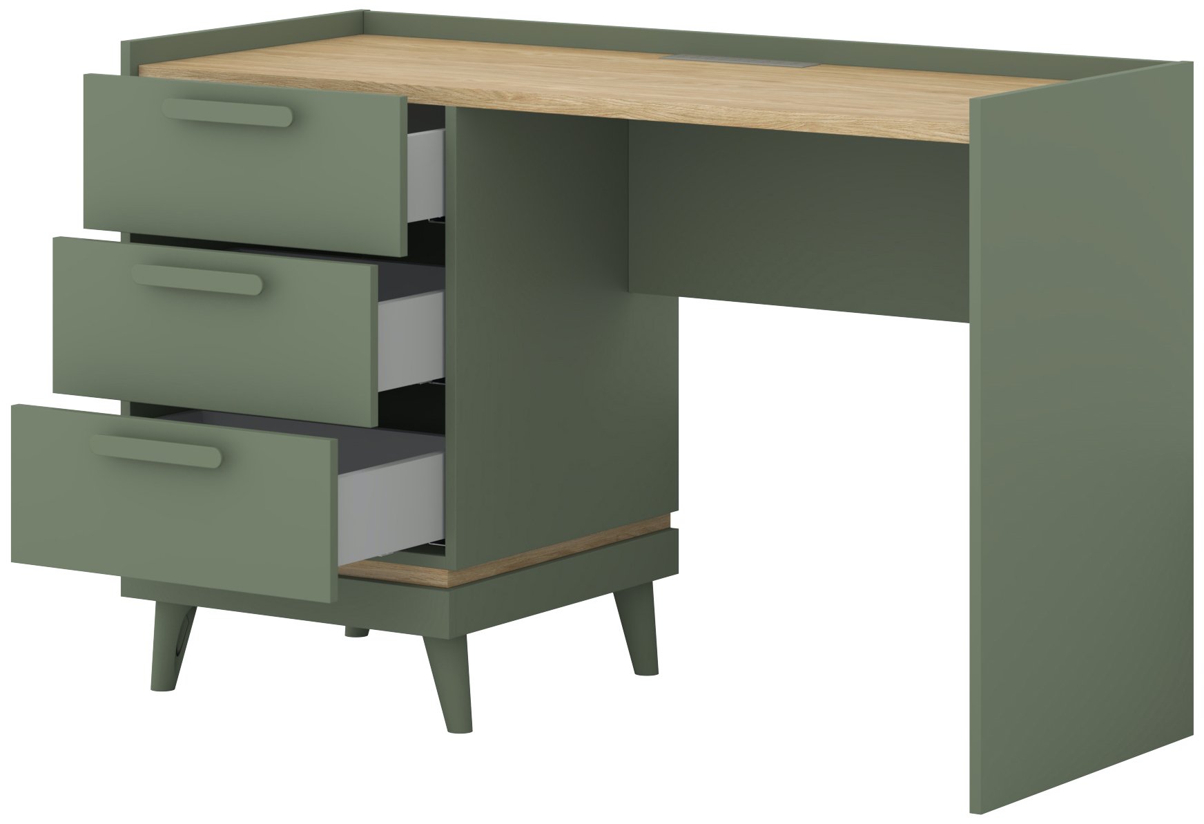 Stvorite savršen kutak za rad, učenje ili stvaranje s modernim i funkcionalnim pisaćim stolom koji spaja skandinavsku estetiku s praktičnošću. Njegova kombinacija toplog tona izblijedjelog zelenog uljenog hrasta i svježe zelene boje donosi dašak prirode u svaki prostor. Čiste linije, minimalistički dizajn i promišljeni detalji osiguravaju da se stol savršeno uklapa i u suvremene stanove i u klasične interijere.