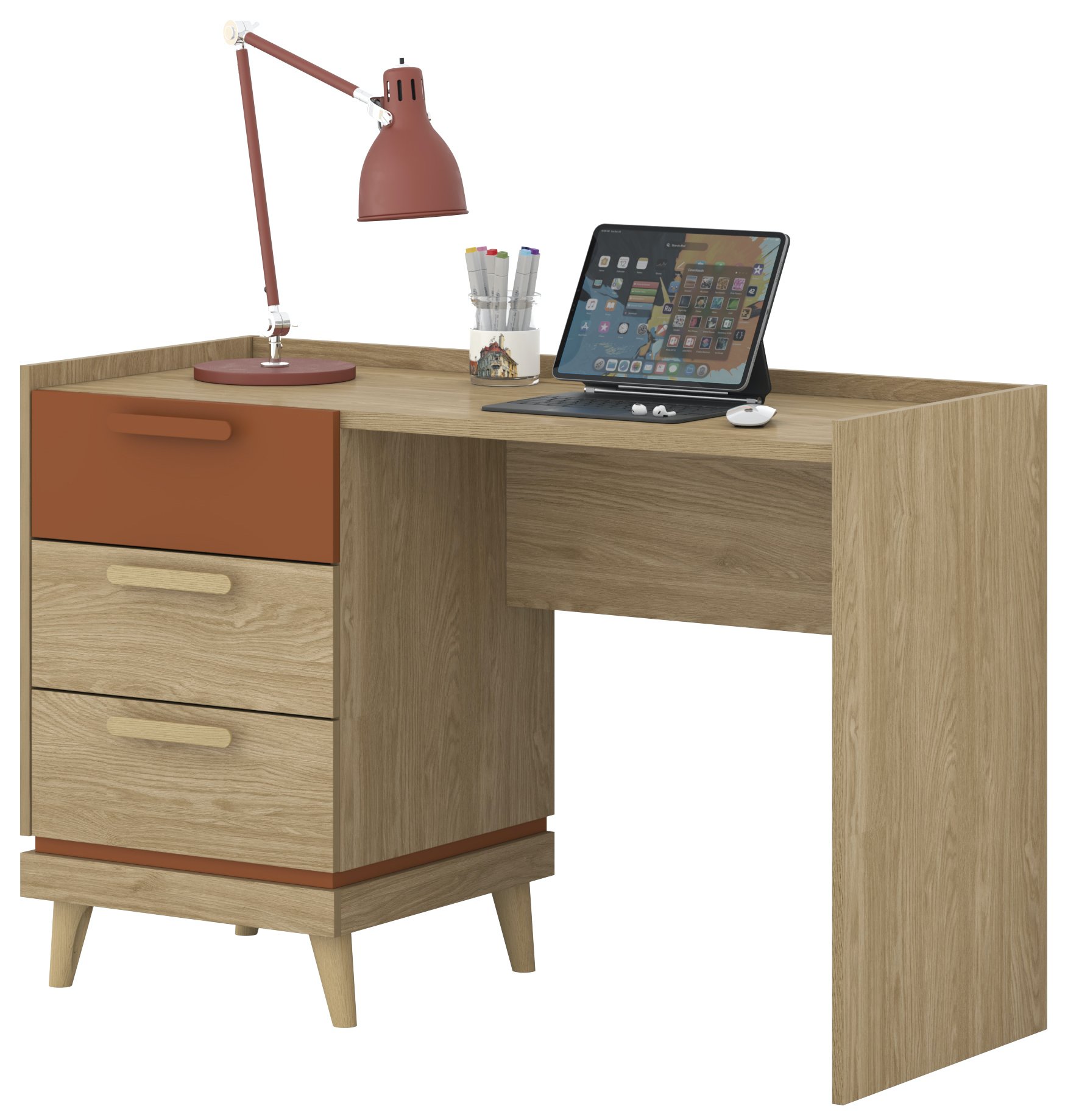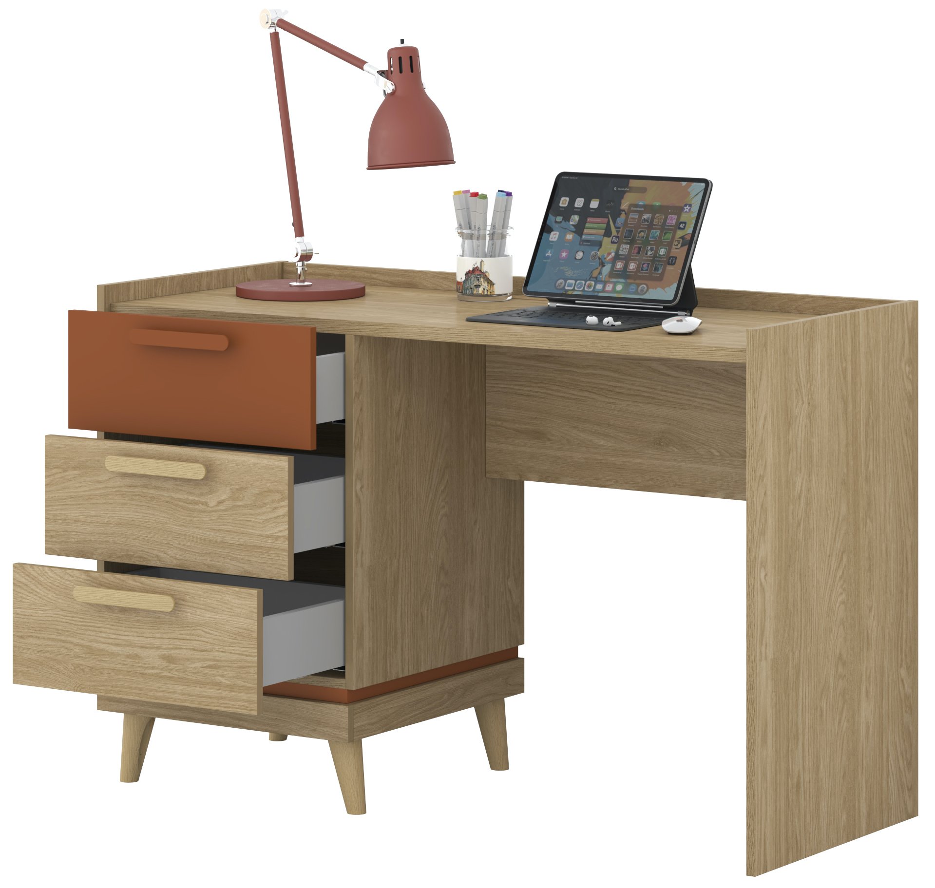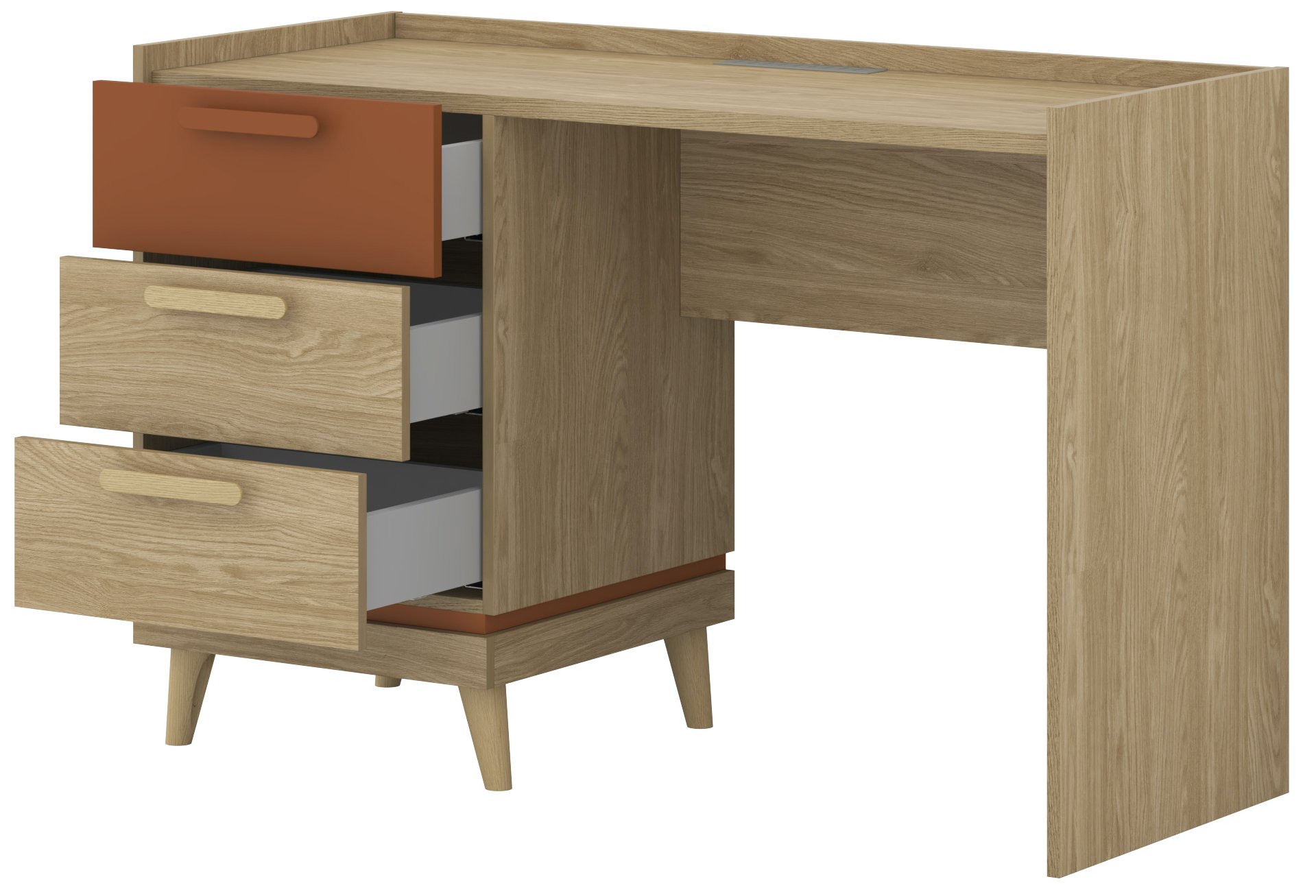 Pisaći stol Scandi u kombinaciji uljenog hrasta i nijanse cigle savršen je izbor za sve koji cijene čist, prirodan i moderan stil uređenja interijera. Svojom uravnoteženom kombinacijom toplih drvenih tonova i minimalističkog oblika odlično se uklapa kako u kućni ured, tako i u dječju ili omladinsku sobu. Njegova kompaktna veličina 120x50x80 cm omogućuje jednostavno postavljanje i u manjim prostorima, bez žrtvovanja udobnosti i funkcionalnosti.
