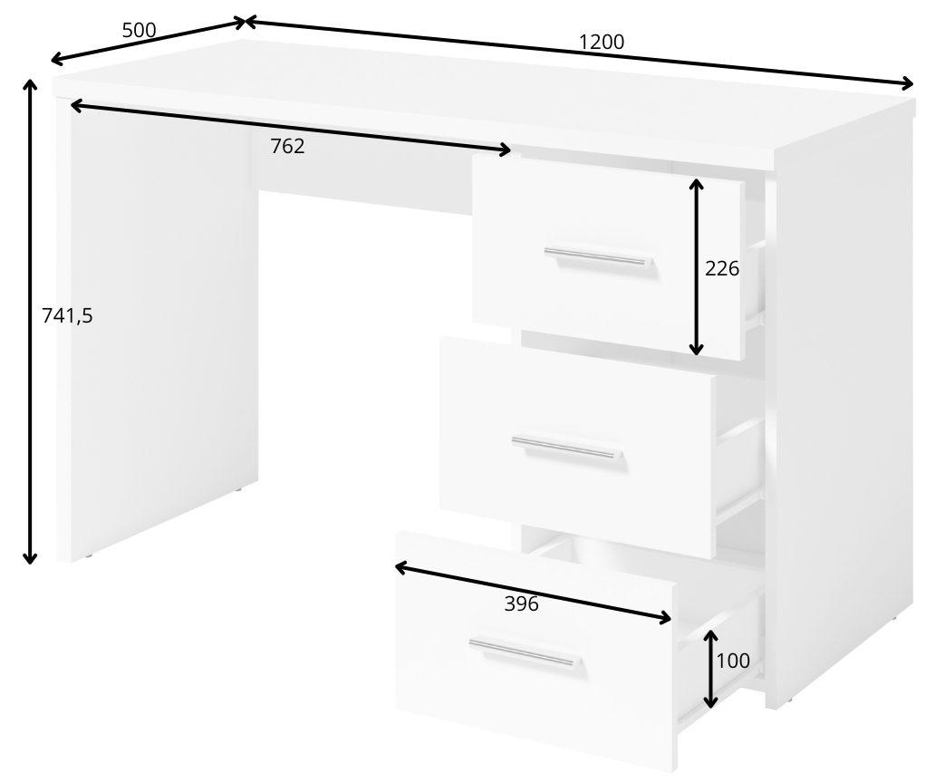 Dimenzije 120x53x75 cm omogućuju optimalno iskorištavanje prostora – dovoljno velika površina za računalo, monitor, dokumente i uredski pribor, a istodobno kompaktan oblik koji se uklapa i u manje prostore. Stol je opremljen s tri prostrane ladice koje nude dovoljno mjesta za pohranu mapa, olovaka, punjača i drugih nužnih dodataka. Plastične ručke su ergonomske i omogućuju jednostavno otvaranje bez većeg napora.