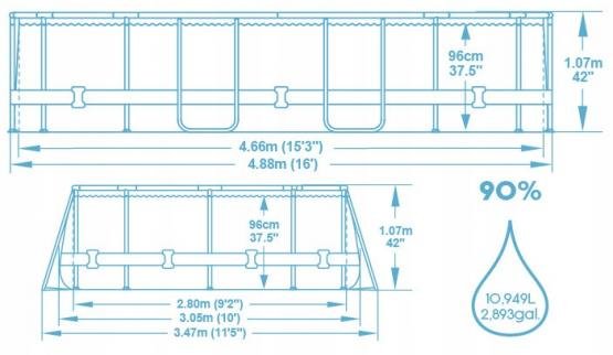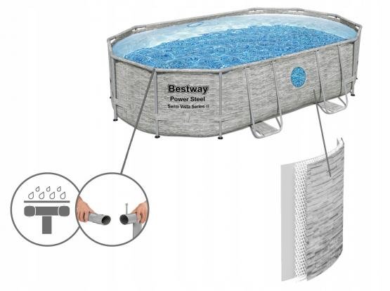 Ovalni bazen - BES56946 s ugrađenim prozorima. Bazen uključuje filter pumpu, sigurnosne ljestve, pokrivač za bazen i ChemConnect™ raspršivač kemikalija za bazen. Dozator ChemConnect održava čistu i zdravu bazensku vodu osiguravajući stabilnu razinu klora koji je ravnomjerno raspoređen po bazenu. Antimikrobni filter produljuje vijek trajanja bazena sprječavajući rast plijesni i drugih bakterija u vodi.