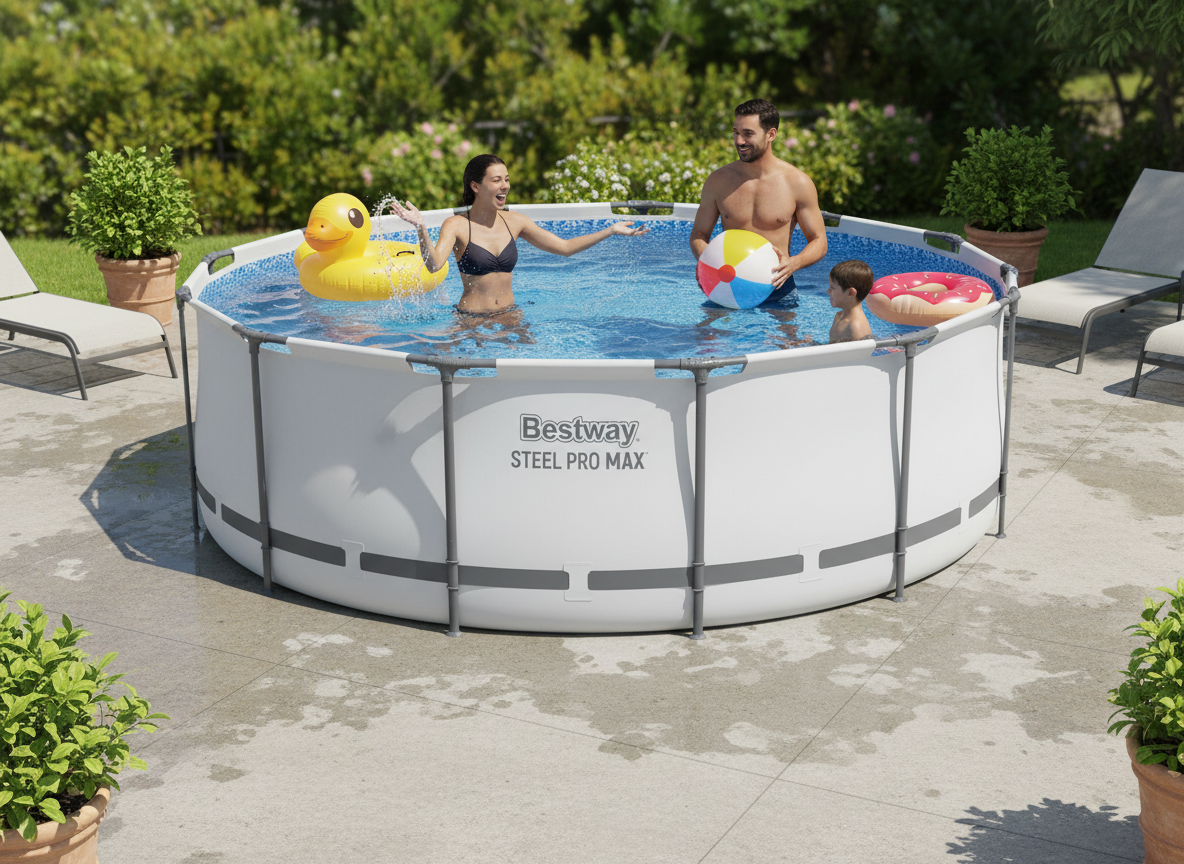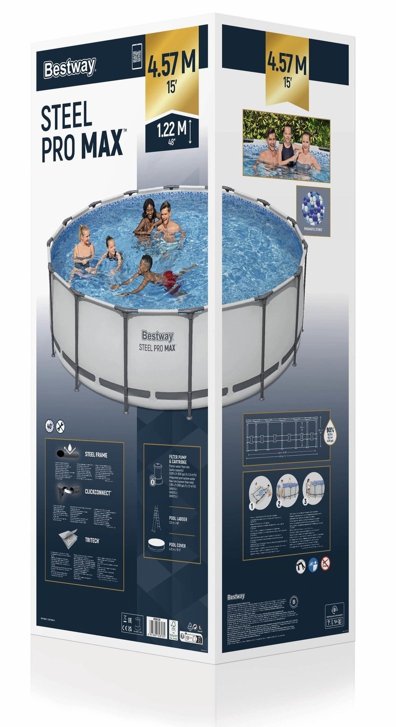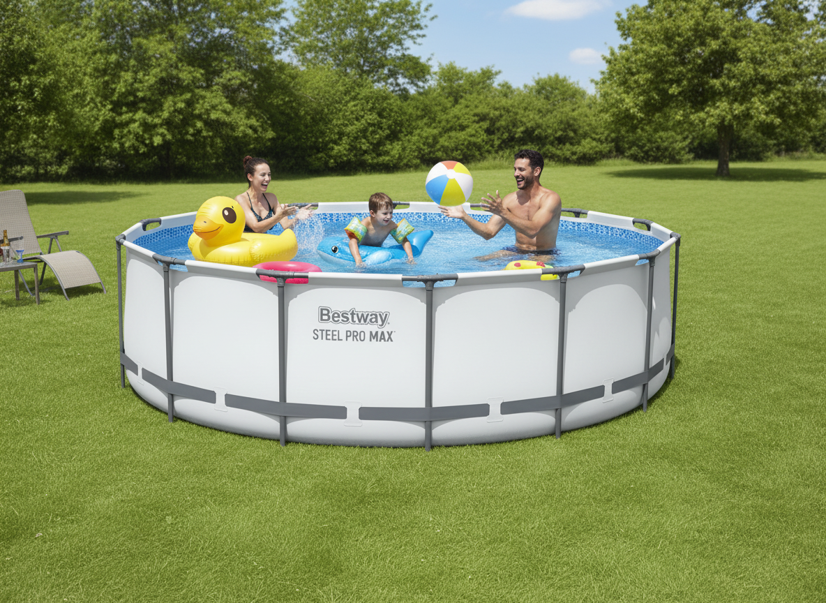 Bestway okrugli bazen s okvirom je namijenjen cijeloj obitelji. Zbog pravilne filtracije i održavanja, vodu trebate zamijeniti samo jednom tijekom cijele sezone kupanja. Rezervoar je izrađen od čvrstog, trostruko slojenog PVC materijala. Zahvaljujući snažnom metalnom okviru, bazen je izdržljiv i stabilan.