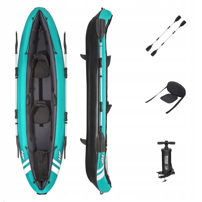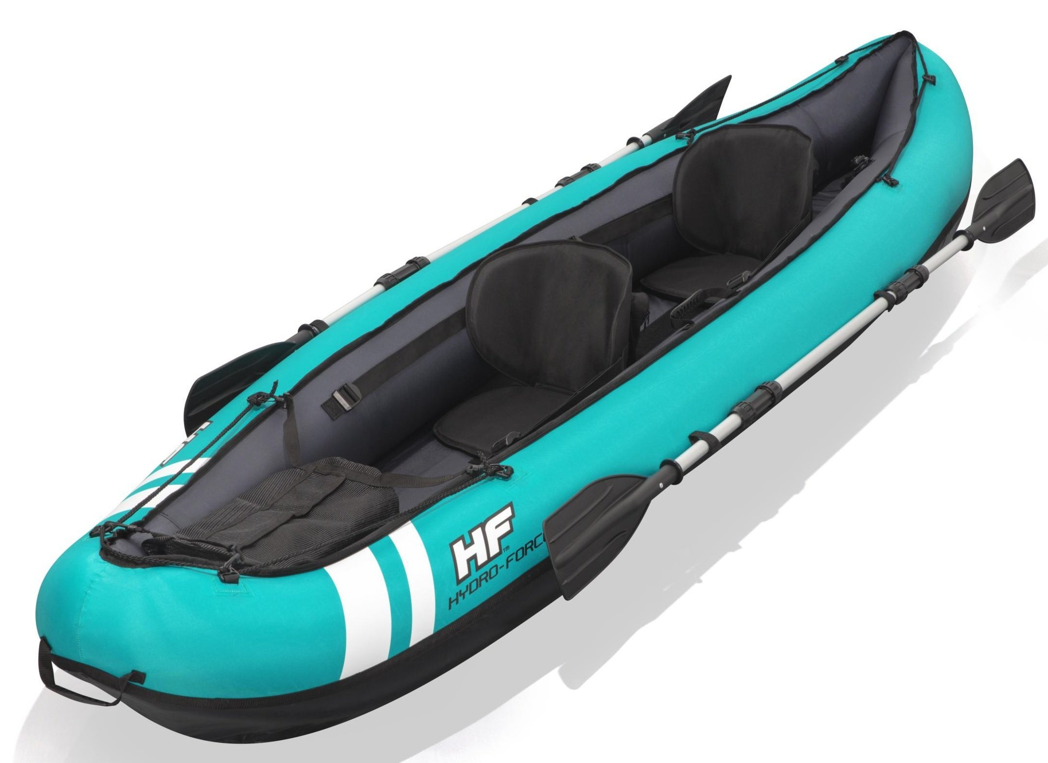 Kajak Hydro-Force™ Ventura Elite™ X2 je savršen čamac za dijeljenje vanjskih iskustava s drugima. Visokokvalitetan, premazani najlon: Visokokvalitetna najlonska obloga kajaka Ventura Elite X2 može podnijeti čak i jače vanjske utjecaje. Tkanina je otporna na ulje i vodu te može izdržati intenzivno sunčevo zračenje. Visokokvalitetna najlonska obloga također je otporna na trganje i izrađena je kako bi podnijela nemirne i često stjenovite vode rijeka. S ovim izdržljivim kajakom možete upravljati kroz vijugave rijeke, jezera ili druge mirne vode bogate valovima. Ključne značajke: Ovaj kajak za 2 osobe, dizajniran za udobnost i potporu s podesivim naslonima, pruža prostor za osnovne stvari kao što su grickalice i voda u lako dostupnom spremištu ispod svakog sjedala. Osim unutarnjeg prostora za pohranu, tu je i odvojiva torba za pohranu koja vam omogućava pristup osnovnim stvarima dok vi i druga osoba veslate po vodi. Dvostruka vesla izrađena su od laganod aluminija i ostaju poravnata s kajakom pomoću sigurnih kopči za vesla. Na svakoj strani nalaze se čvrste ručke koje olakšavaju pomicanje kajaka. Kajak Ventura Elite X2 ima 2 odvojive peraje koje možete zamijeniti ovisno o vodenim uvjetima kako biste poboljšali stabilnost smjera. Kada završite putovanje, kajak jednostavno ispraznite, složite i pohranite u priloženu torbu.