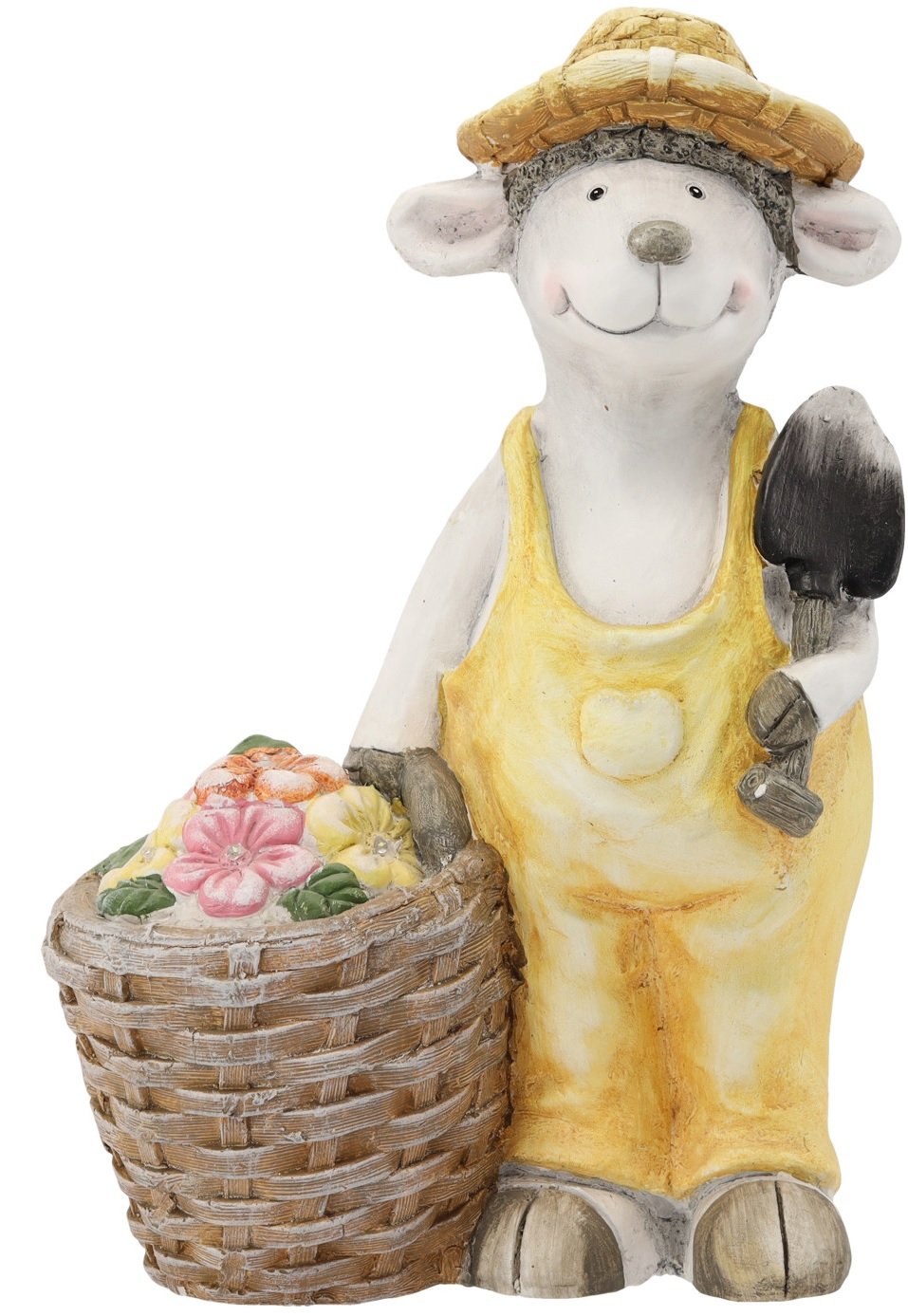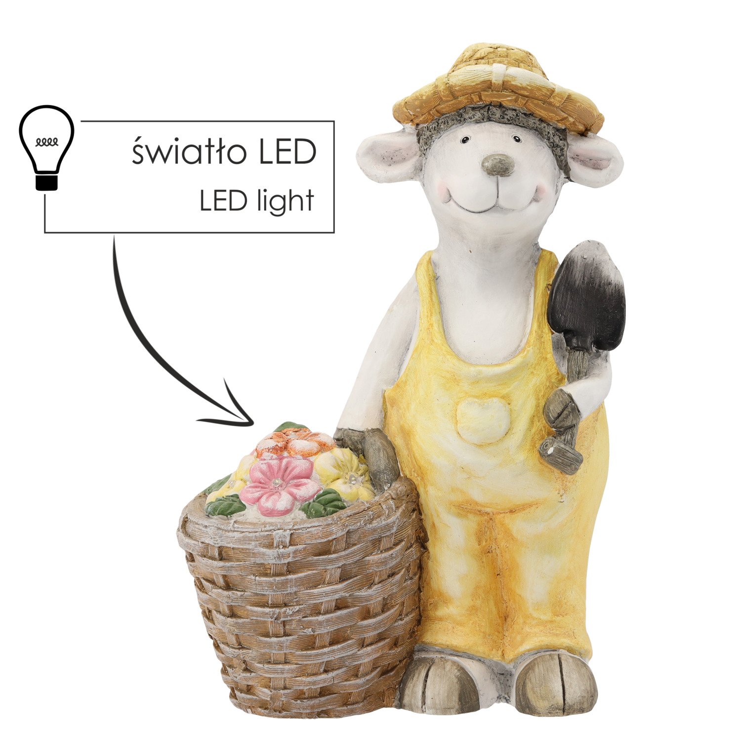Keramička vrtna dekoracija ovna u žutom kombinezonu s košarom cvijeća i LED osvjetljenjem odličan je i jedinstven ukras. Figura je originalan ukras vrta, terase ili balkona. Oživite svoj vrt ovim neodoljivim komadom. Veličina figure je 32 x 18,5 x 47 cm.