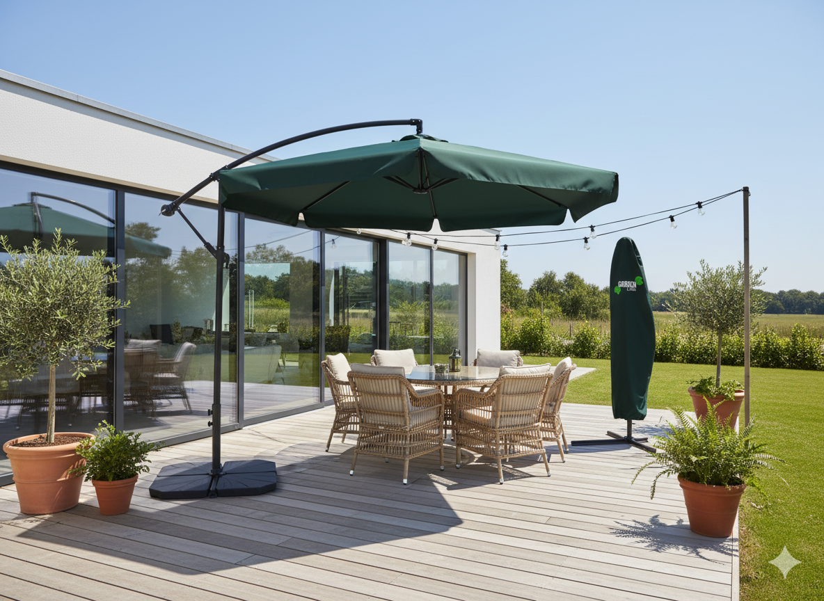 Suncobran od visokokvalitetnih materijala. Sadrži vodootporni materijal, 100% je otporan na vremenske uvjete. Sklapanje i rasklapanje su jednostavni zahvaljujući ručki. Suncobran ima veliko i čvrsto postolje od lakiranog čelika! Njegovu stabilnost osiguravaju posebne rupe na okviru ili posebni utezi (kupuju se zasebno) namijenjeni pričvršćivanju suncobrana na tlo kako bi se sprječila vjerojatnost prevrtanja! Suncobran ima mogućnost podešavanja nagiba. To omogućuje zaštitu od sunčeve svjetlosti bez obzira na kut padanja svjetlosti.