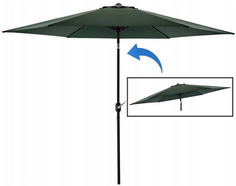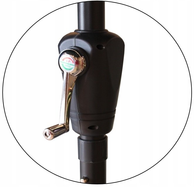 Senčnik je izdelan iz visoko kakovostnih materialov. Ima vodoodporen material, zaradi česar je odporen na vremenske razmere. Zlaganje in odpiranje je zelo enostavno zahvaljujoč ročaju. Ima veliko in trdno stojalo iz prašno barvanega jekla. Svojo stabilnost ima zaradi posebnih lukenj na okvirju ali posebnih uteži (kupite jih dodatno), ki so namenjene pritrditvi dežnika na tla. Poleg tega je sprednja noga podaljšana. Vidite ga lahko na zgornji fotografiji.