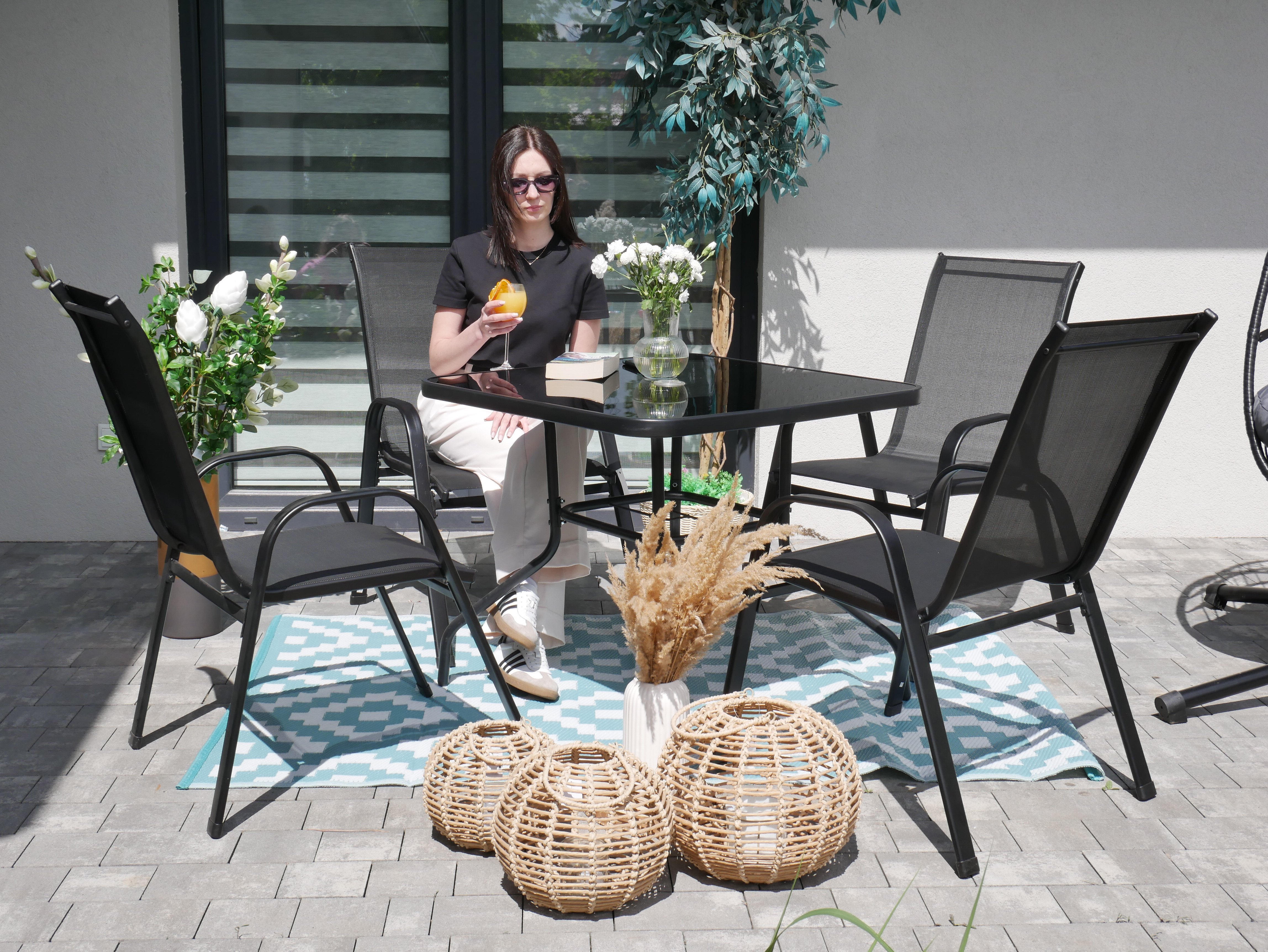Garnitura se lijepo uklapa u različite stilove vanjskog uređenja – od minimalističkog modernog ambijenta do klasičnog rustikalnog izgleda. Crna boja djeluje elegantno i neutralno, pa je možete bez poteškoća kombinirati s raznobojnim jastučićima, drvenim dodacima ili solarnim svjetiljkama.