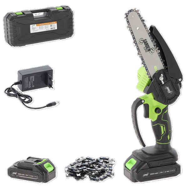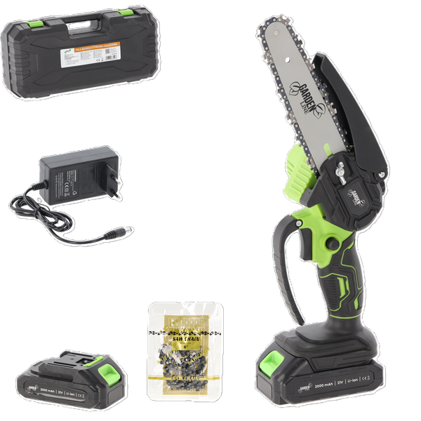 Pila je opremljena izdržljivim lancem koji se kreće brzinom od 8 m/s – dovoljno za precizne i glatke rezove pri obrezivanju suhih ili svježih grana. Četkasti motor snage 600 W optimiziran je za učinkovitu potrošnju energije, što znači duže vrijeme rada na jednom punjenju. Paket uključuje čak dvije litij‑ionske baterije od 1500 mAh, pa jednu možete koristiti dok se druga puni. Priloženi punjač omogućuje brzo obnavljanje energije, a kompletu je dodan i plastični kofer za sigurno pohranjivanje i transport te dodatni lanac koji produžuje vijek trajanja alata.