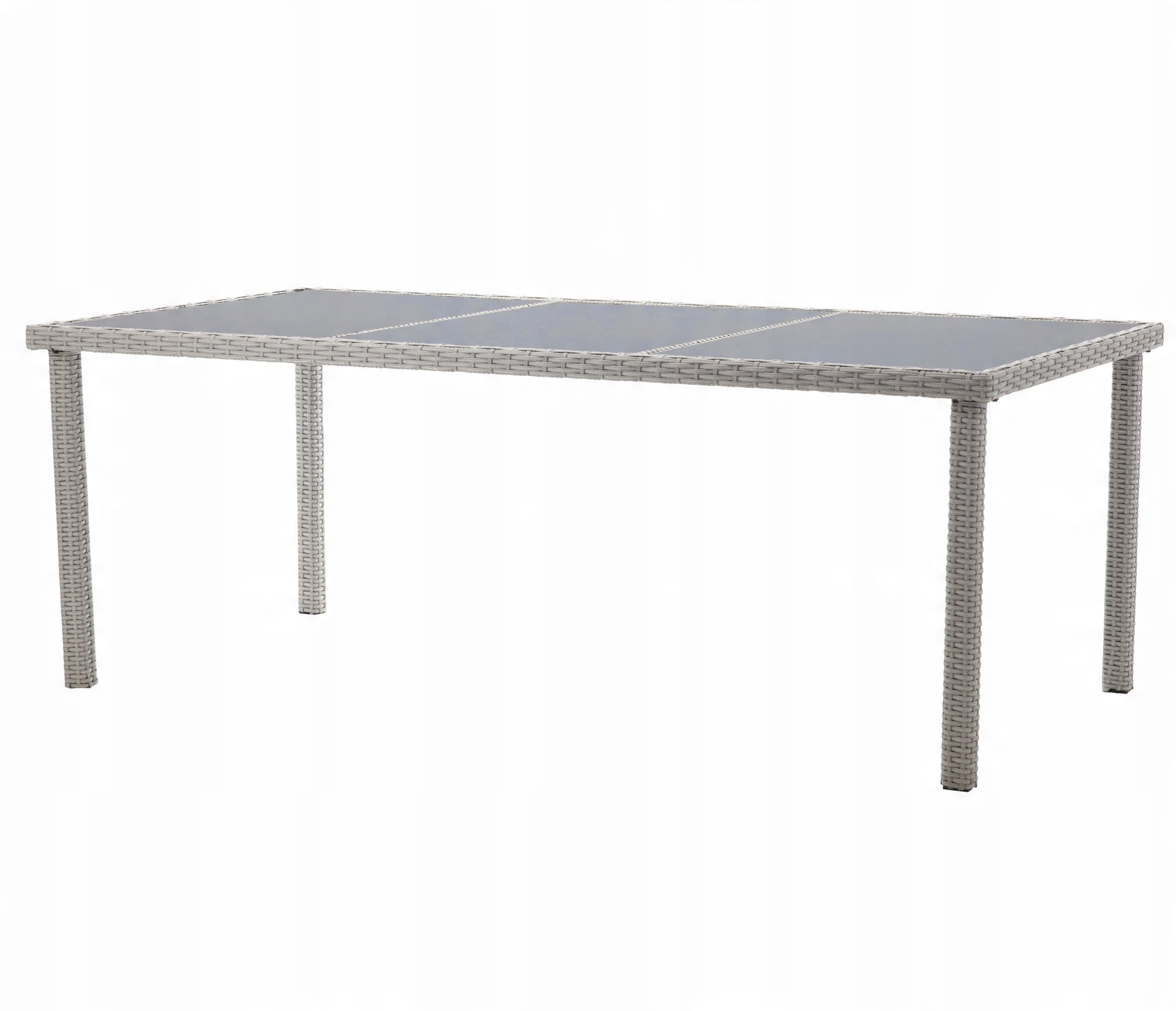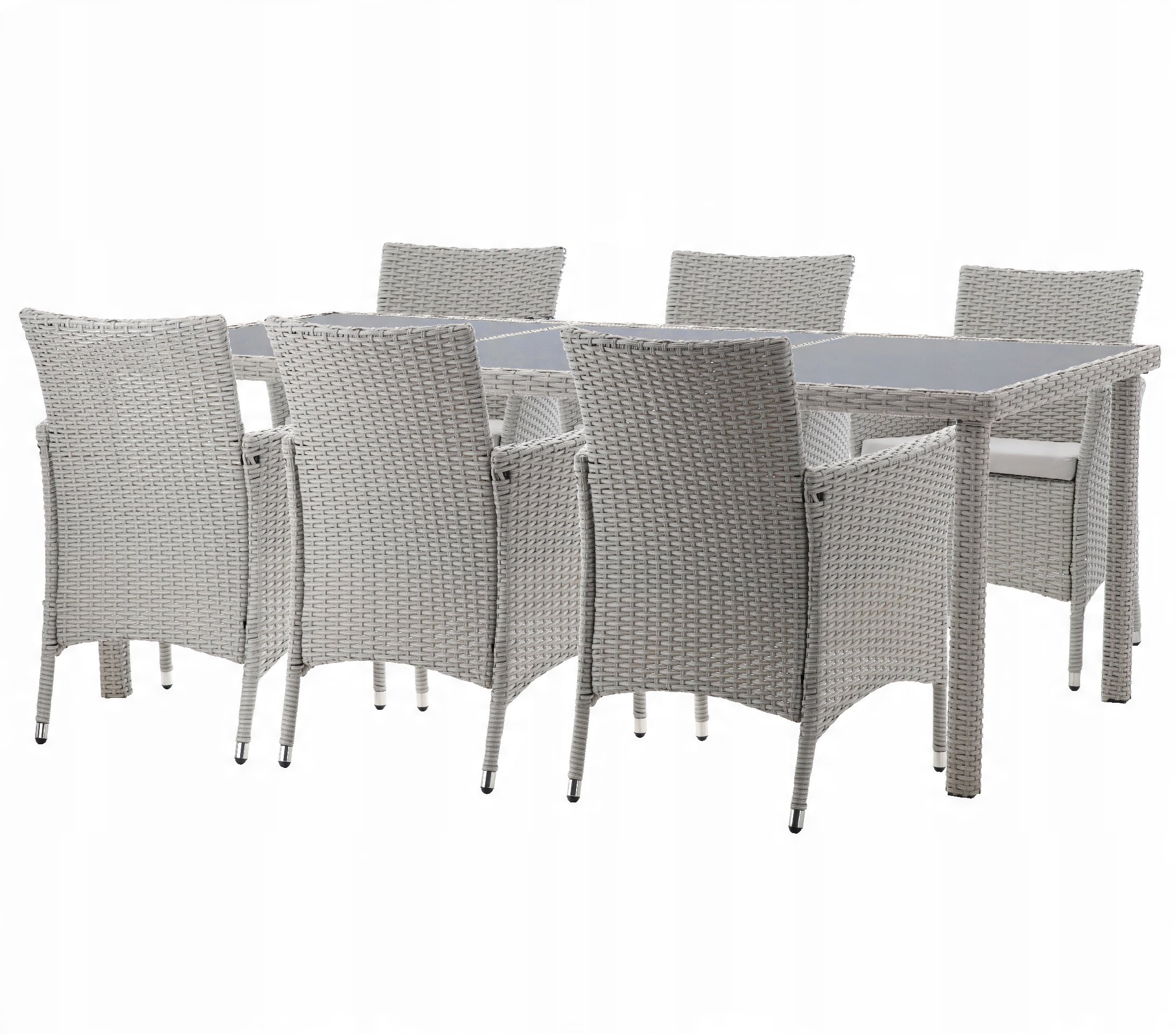 Komplet uključuje osam ergonomskih stolica dimenzija 60 × 59 × 82,5 cm, koje svojom formom i visinom naslona osiguravaju udoban položaj sjedenja. Jastučići za sjedenje izrađeni su od vodootpornog poliestera u odgovarajućem sivom tonu, što omogućuje bezbrižno korištenje i u slučaju iznenadnog prskanja ili visoke vlažnosti zraka. Materijal jastučića jednostavan je za čišćenje, pa ćete svoj vrtni prostor uvijek moći održavati urednim i ugodnim za korištenje. Stol veličine 196 × 98 × 73 cm nudi dovoljno prostora za objedovanje, druženje ili opušteno ispijanje kave u ugodnom društvu.