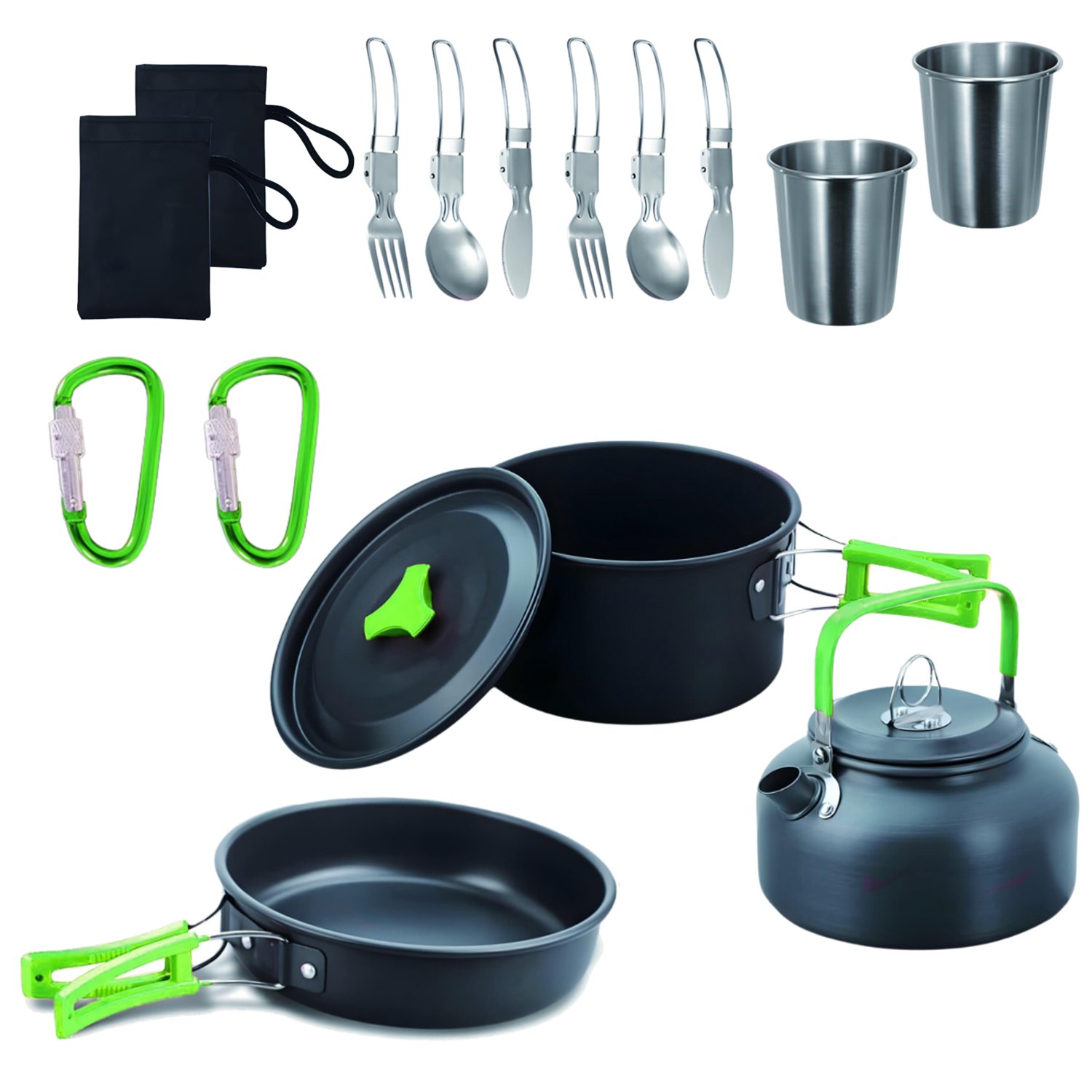 Set posuđa za kampiranje 18u1 sadrži sve bitne elemente za pripremu obroka na otvorenom. U kompletu ćete pronaći lonac, tavu, čajnik s poklopcem, dva pribora (nož, vilica, žlica), dvije šalice, dva karabinera i etuije za jednostavno spremanje. Svaki dio ima svoje mjesto, što omogućuje brzu i preglednu organizaciju. Zahvaljujući posebno oblikovanim dimenzijama (18 × 10 cm), svi se dijelovi spremaju jedan u drugi i tvore kompaktan paket koji zauzima minimalno prostora u ruksaku ili prtljažniku.