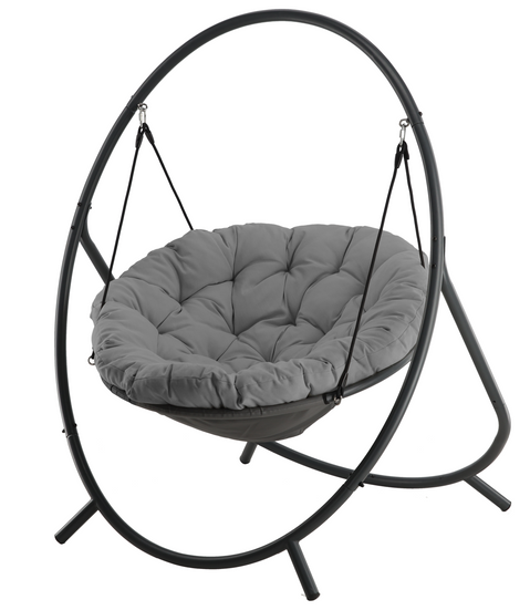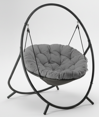 Viseća fotelja Patio – Chomik dizajnirana je za one koji traže savršenu ravnotežu između elegancije, funkcionalnosti i opuštanja. Njena čvrsta čelična konstrukcija osigurava stabilnost, dok kvalitetni materijali omogućuju dugotrajnu upotrebu kako na otvorenom tako i u unutarnjim prostorima. Tamnosiva boja jastuka i sivi okvir stvaraju moderan izgled koji se lijepo uklapa s različitim stilovima namještaja – od minimalističkih do rustikalnijih ambijenata.