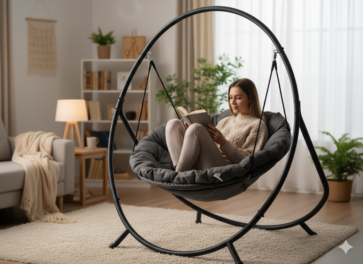Sjedeći dio viseće fotelje izrađen je od tkanine Oxford 600D × 600D, poznate po visokoj otpornosti na habanje, kidanje i razvoj plijesni. Tkanina je prozračna i ugodna na dodir, što omogućuje ugodno sjedenje i tijekom toplijih mjeseci. Madrac od predenog poliestera dodatno poboljšava udobnost jer pruža upravo dovoljnu mekoću i potporu tijelu. Zbog ovih svojstava fotelja nije samo estetski dodatak, već i funkcionalan komad namještaja koji poziva na opuštanje nakon napornog dana.