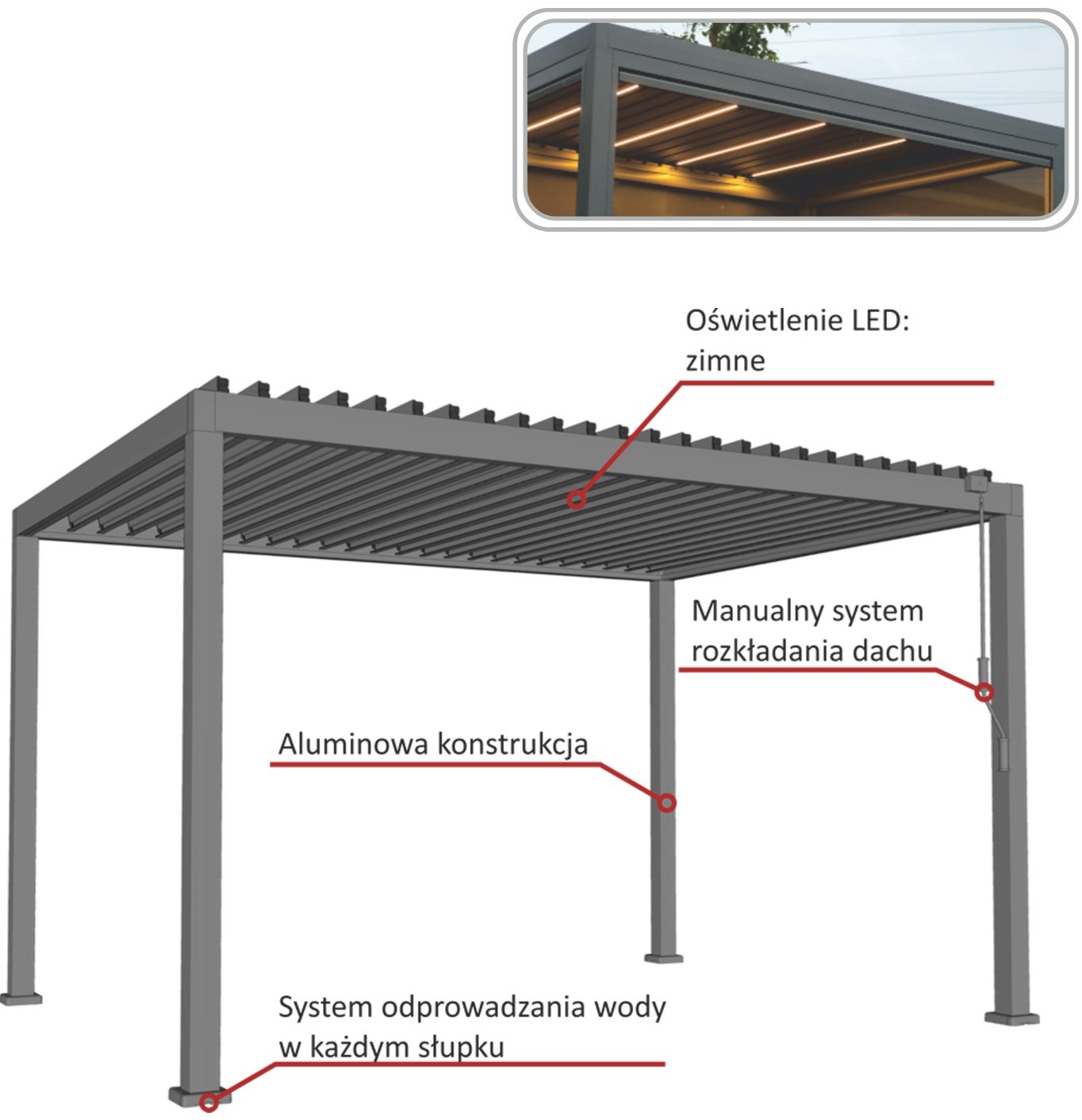 Aluminijska pergola, predstavljena u ovom kompletu, čvrsta je konstrukcija, namijenjena za cjelogodišnju upotrebu na vrtnim i terasnim površinama. Njen stabilan okvir izrađen je od aluminijskih profila povećane debljine, što osigurava visoku otpornost na opterećenja i trajnost u vanjskim uvjetima. Upotrijebljene dvostruke lamele omogućuju bolju stabilnost, učinkovitije odvođenje vode te povećavaju ukupnu krutost cijele konstrukcije.