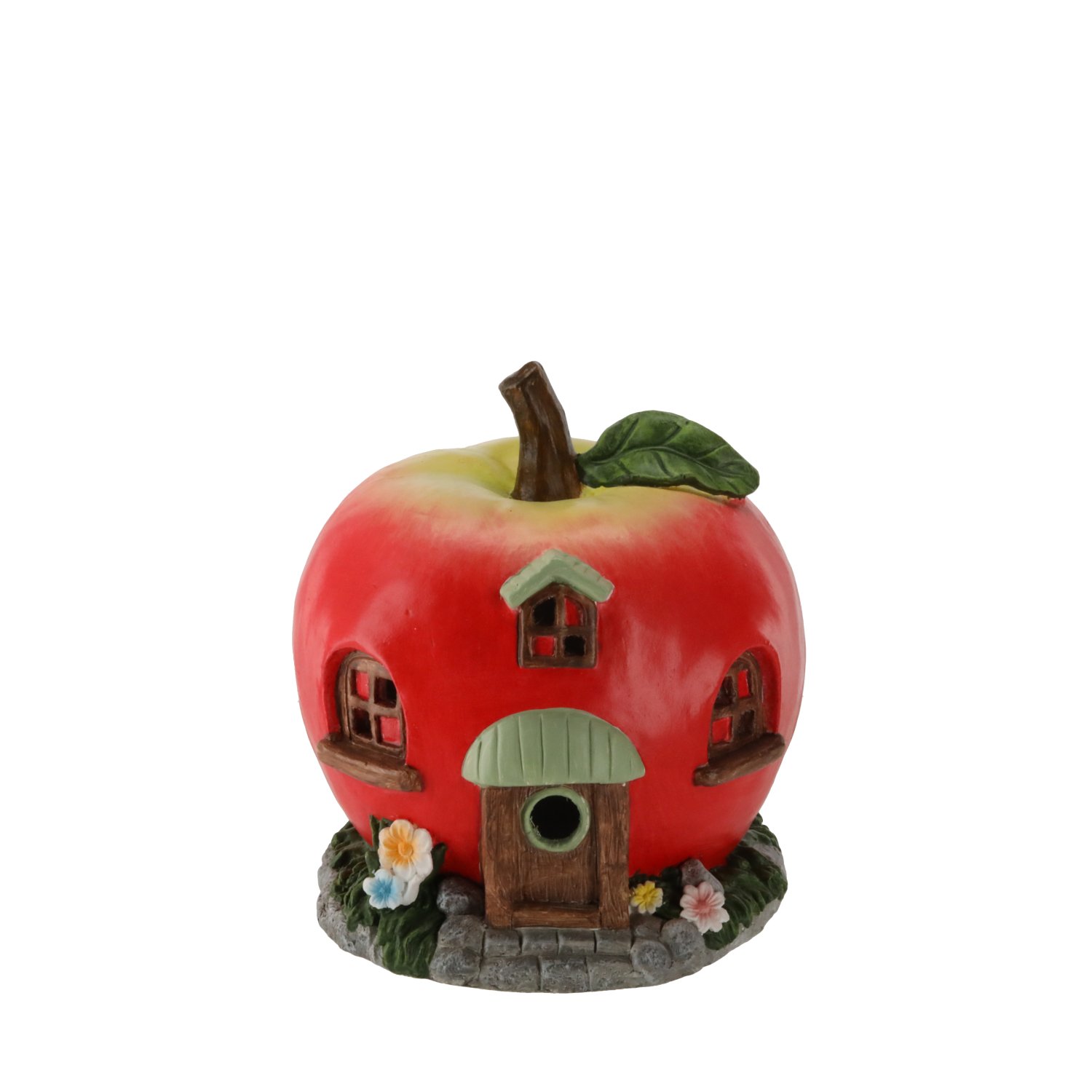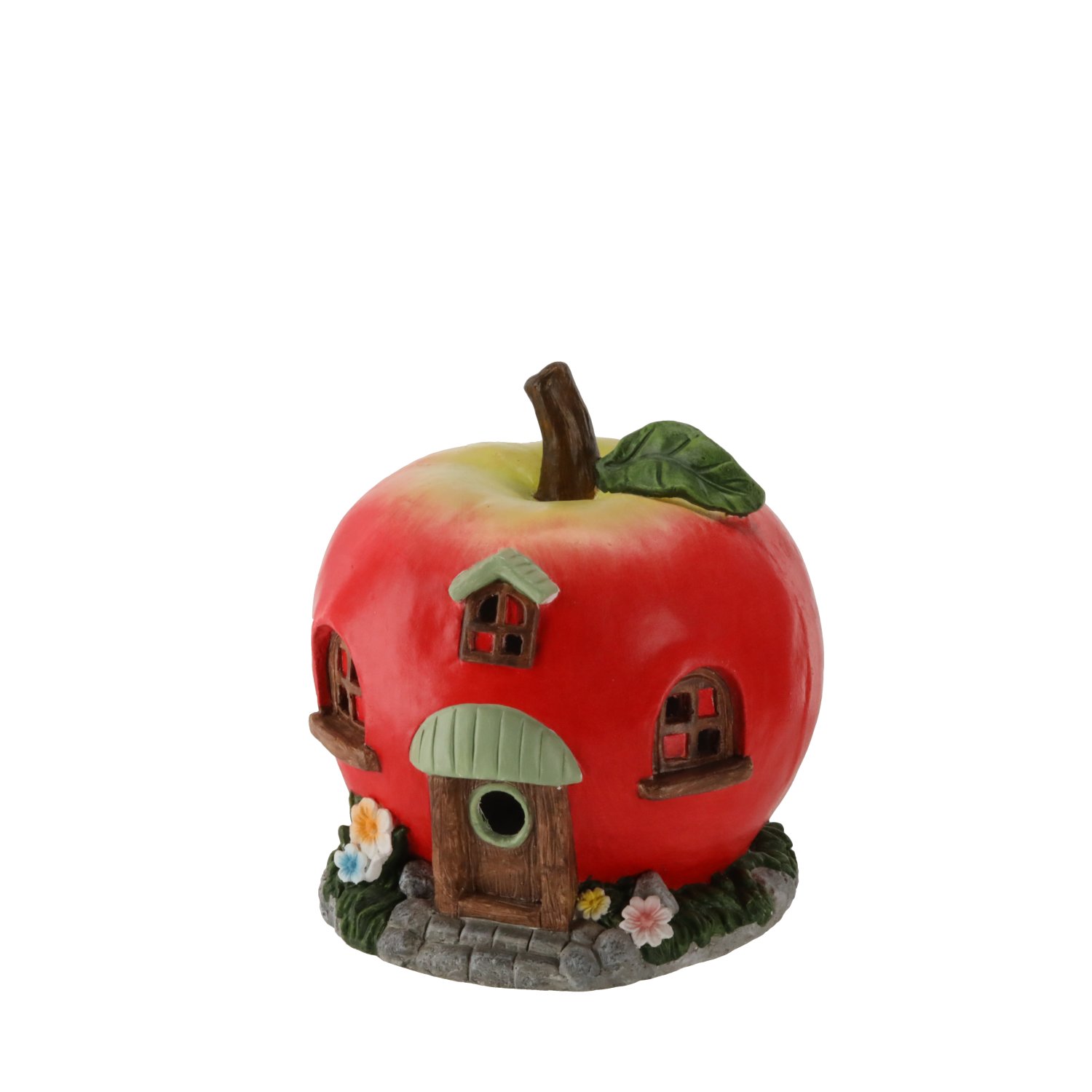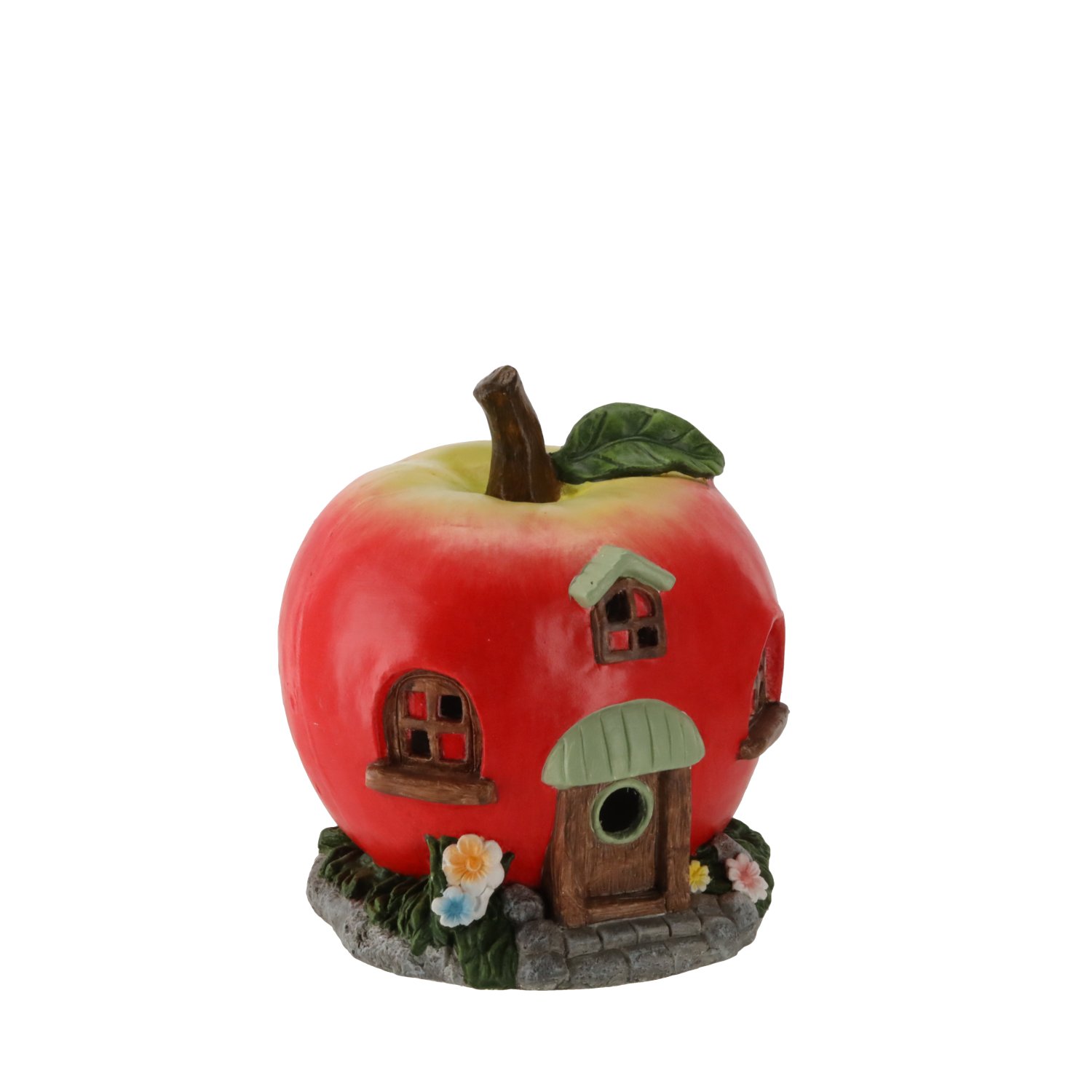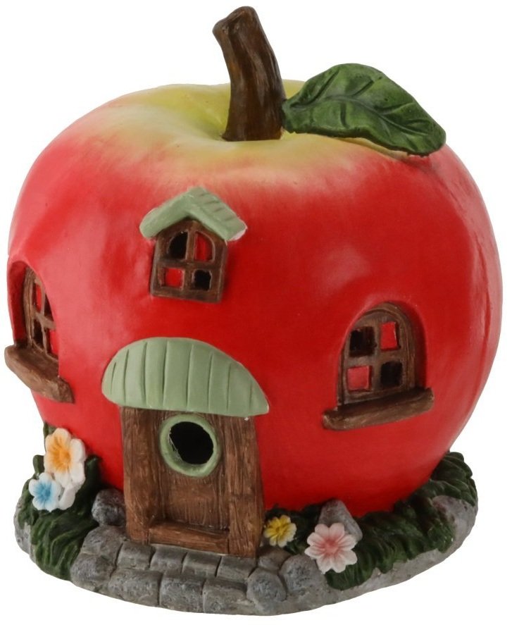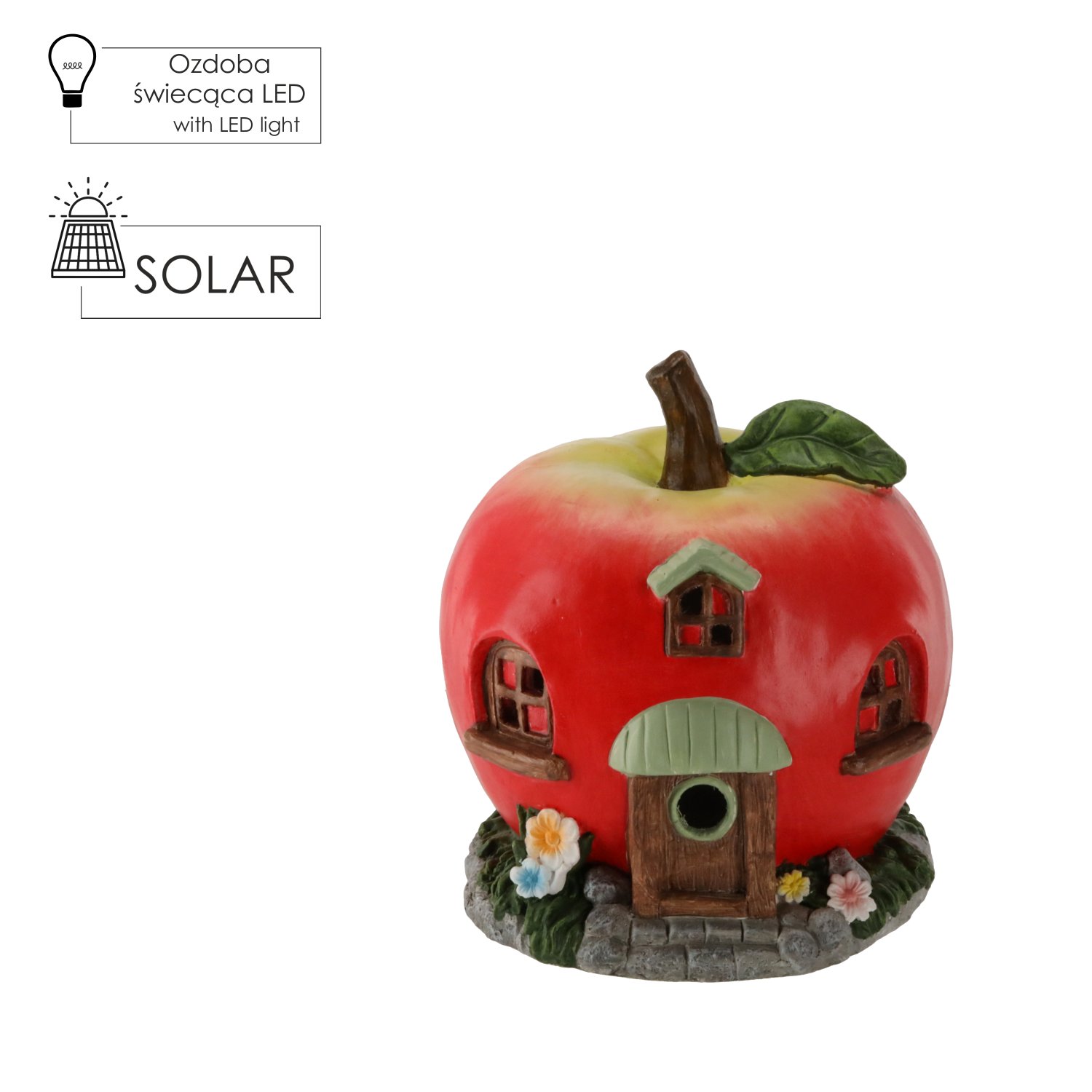 Vrtna figurica oblikovana je u obliku crvene jabuke, koja prikazuje malu kućicu s prozorima, vratima i sitnim detaljima koji stvaraju bajkovitu atmosferu. Crvena boja kućišta podsjeća na svježinu prirode i lijepo se slaže sa zelenilom vrtnog bilja. U unutrašnjosti kućice ugrađena je LED rasvjeta, koja nakon uključivanja nježno prodire kroz otvore i stvara toplo, privlačno svjetlo. Svjetlosni efekt nije prejak, pa figurica djeluje suptilno, ali istodobno dovoljno izražajno da se može promatrati i u večernjim satima.