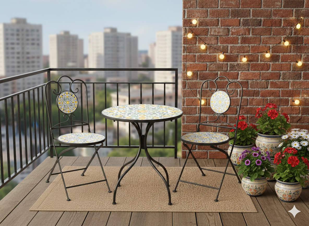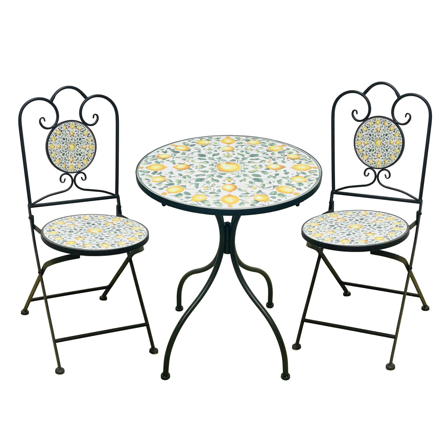 U svoj vrt, terasu ili balkon unesite dašak mediteranske elegancije. Komplet Lemonia oduševljava dekorativnim mozaikom nadahnutim citrusnim motivima i čvrstom metalnom konstrukcijom. To je savršena kombinacija stila, trajnosti i funkcionalnosti – idealna i za jutarnju kavu i za večernji odmor na svježem zraku.