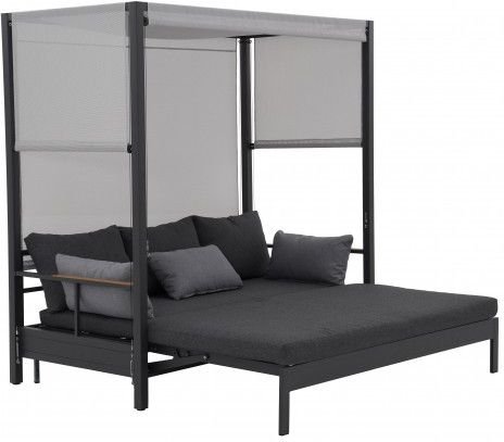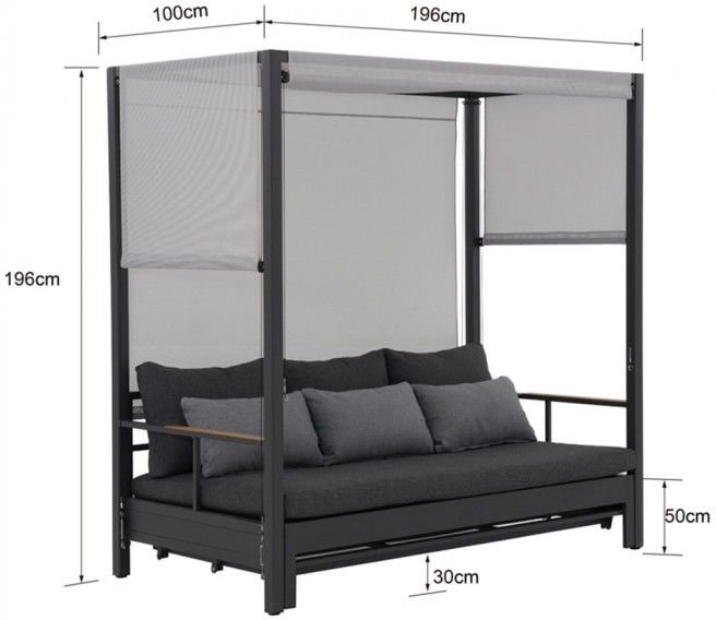Vrtna garnitura, s funkcijom produženja u veći krevet i elegantnim baldahinom, je savršen dodatak za vaš vrt ili terasu. Izrađena je od aluminijskog okvira s zaštitnim premazom, te izgleda vrlo elegantno i otporna je na promjenjive vremenske uvjete i koroziju. Okvir kreveta pažljivo je dizajniran kako bi osigurao stabilnost i izdržljivost, savršeno mjesto za opuštanje na otvorenom.