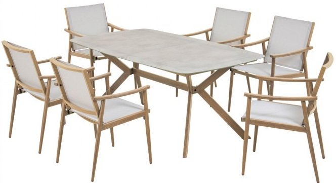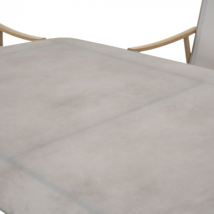 Ploča stola izrađena je od keramike, što donosi elegantan izgled, ali i visoku otpornost na toplinu i vlagu. Keramika se lako čisti i ne upija tekućine, što je čini savršenim izborom za vanjske prostore. Sjedalice su ergonomski oblikovane, pružajući potporu i udobnost čak i tijekom dužeg sjedenja. Zahvaljujući laganom, ali čvrstom okviru, stolice se mogu jednostavno pomicati prema potrebi, a njihova konstrukcija osigurava stabilnost tijekom korištenja.
