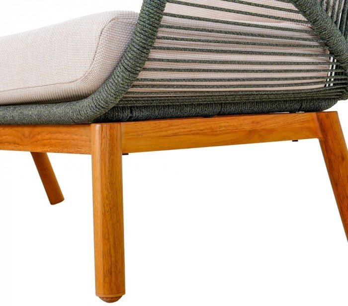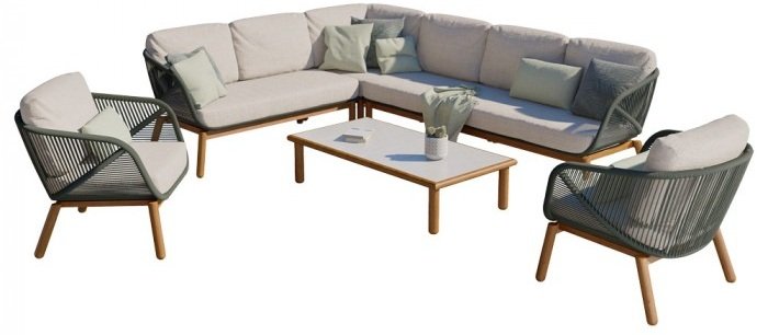 Vrtni namještaj opremljen je čvrstom aluminijskom konstrukcijom koja mu pruža iznimnu otpornost na promjenjive vremenske uvjete. Aluminij, obojan tehnologijom heat transfer u boju drveta, izgleda moderno i čvrst je. Mekani jastuci od olefinske tkanine spajaju udobnost i jednostavno održavanje čistoće, a njihova trajnost osigurava da će namještaj izgledati izvrsno tijekom cijele sezone.